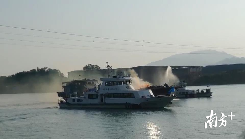 演习现场模拟了“粤韶关货A”在行驶过程中和“粤韶关货B”发生碰撞,A船起火失控,往下游白石窑水电站方向漂去,随时危及下游水电站和桥梁安全,与此同时“粤韶关货B”因碰撞有两名人员落水并出现溢油险情,附近水面出现大量浮油,请求救援。接警后,韶关市水上搜救中心迅速响应,按照应急预案要求上报险情,并协调船艇和无人机等力量,使用专业设备,协助扑灭船舶明火、离泊前往安全水域、完成落水遇险人员救助和溢油应急处置。