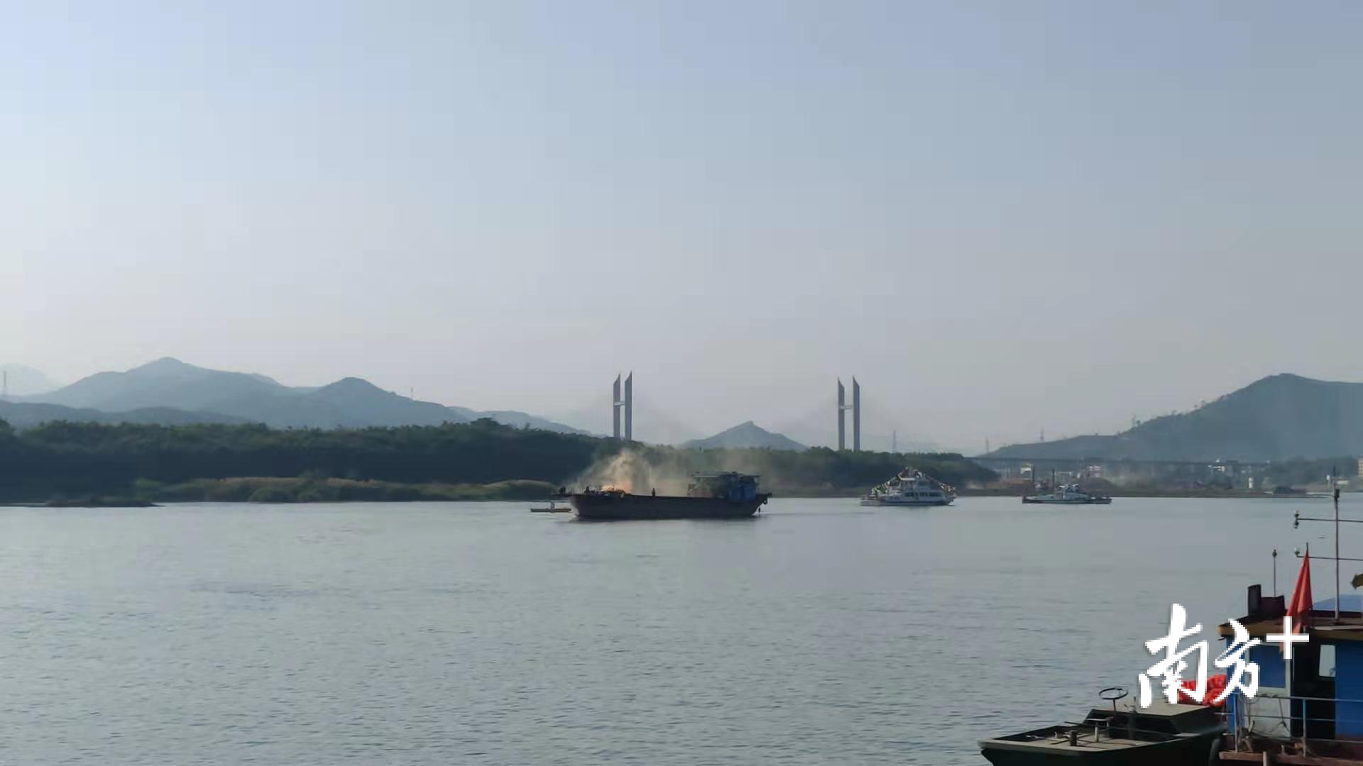 “12395,我是粤韶关货A,在乌石渡口水域与粤韶关货B发生碰撞,船舶起火失控,有2名人员落水,并有溢油,请求紧急救援!”11月6日下午,韶关市水上搜救中心在乌石港附近水域举办了“水清船畅 平安三江”2019年韶关市水上突发事件应急演练。