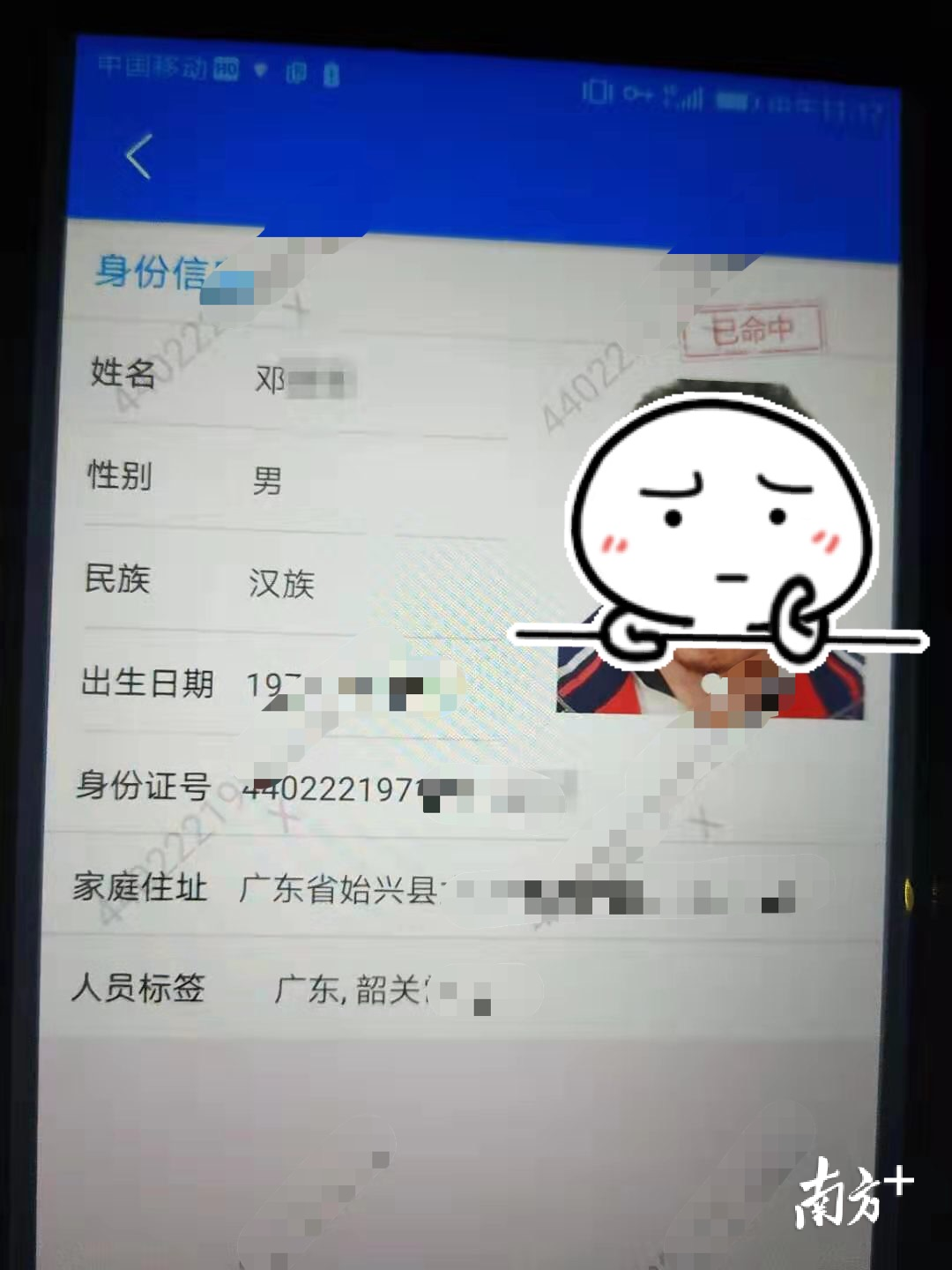 接报后,值班民警迅速赶到现场处理。到达现场后,民警尝试着与流浪人员进行沟通交流,但是由于与其沟通困难,民警只从流浪人员口中得知其是始兴县北山人。随后民警借助移动警务终端人脸识别系统,最终确定了该男子邓某(男,48岁)的身份,并立即联系其的家属。