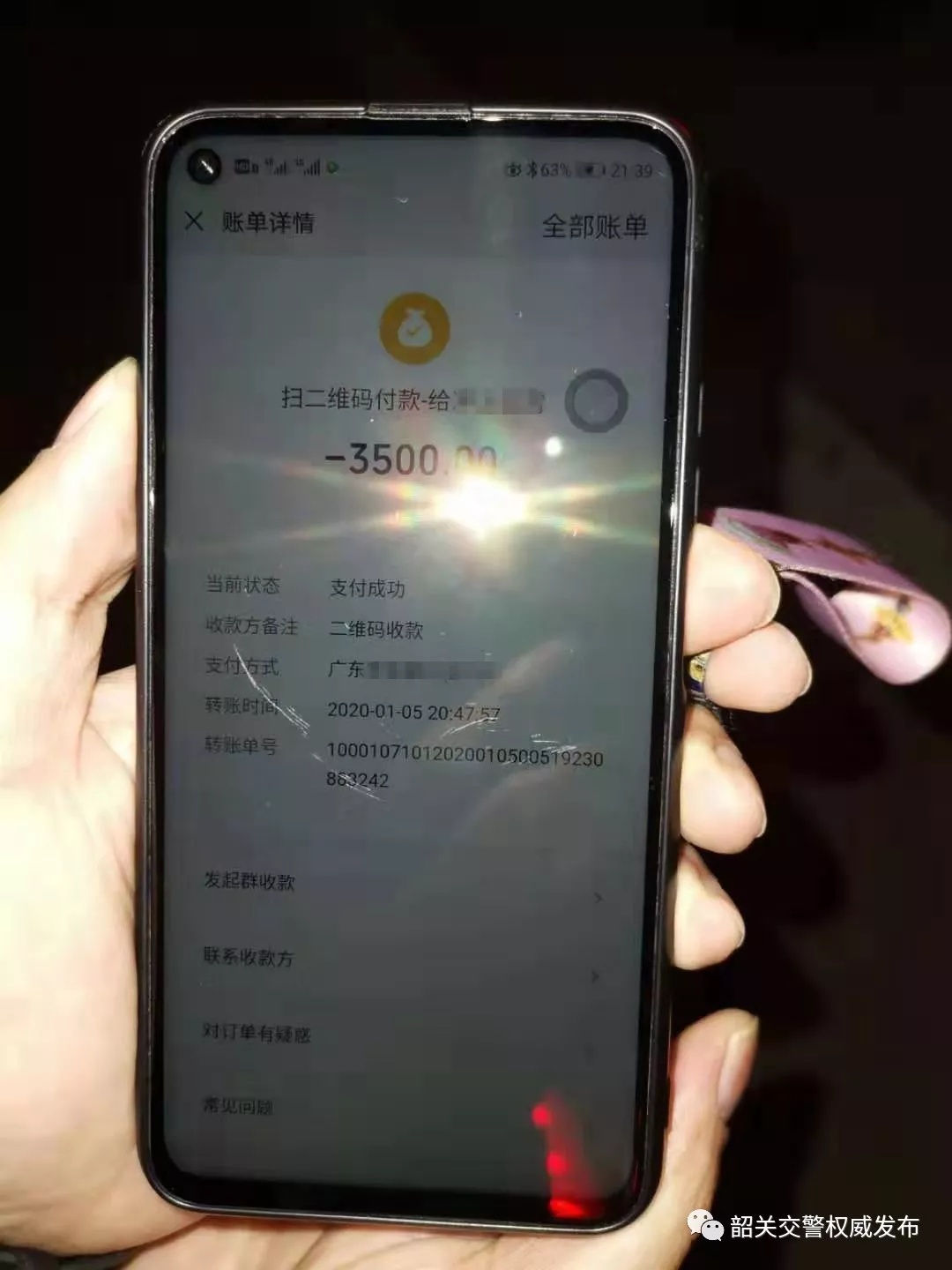 经民警了解,黄先生驾驶鄂D*****小客车在乐广高速公路北行(往目的地湖北)61公里处附近时被一辆悬挂粤A*****的黑色奔驰轿车(车上共两名男子)以发生碰撞接触为由逼停至应急车道,其中一名男子采用勒住事主脖子的手段威胁王先生赔偿人民币一万元,黄先生因现金不多便示意其妻子郑某用其手机微信支付给对方3500元。
