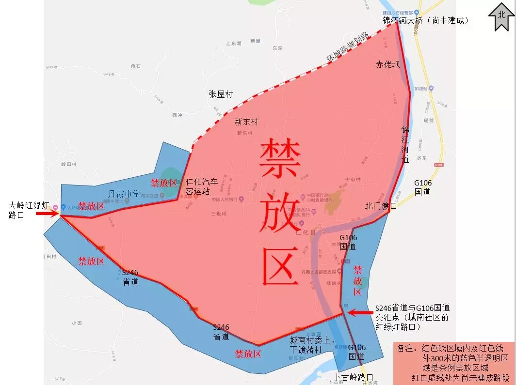 (三)西面以“大岭红绿灯路口”为界往东北沿建设路至仁化客运站路口转新环城公路至张屋村边(其中沿建设路丹霞中学至仁化客运站路口西面300米范围内为禁放区)。