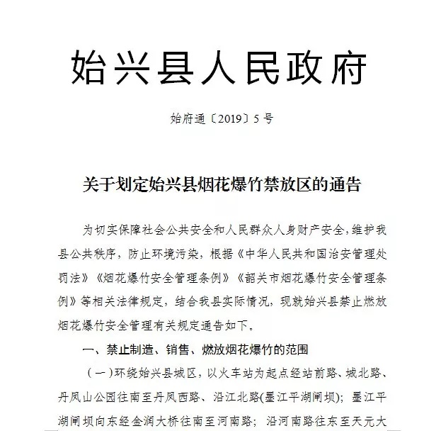 《韶关市人民政府关于扩大市区禁止燃放烟花爆竹区域的通告》(韶府规审 〔019〕10号)已经209年7月12日韶关市人民政府第十四届76次常务会议通过, 现予印发,自209年9月1日起施行,有效期五年。