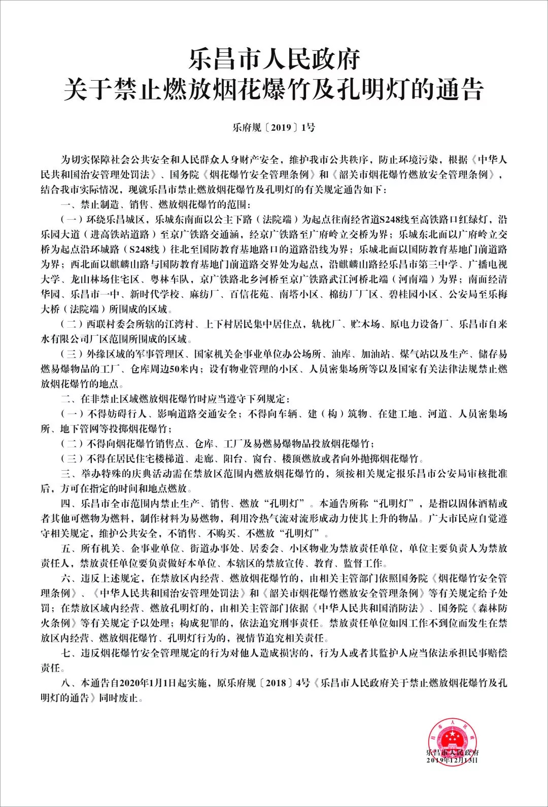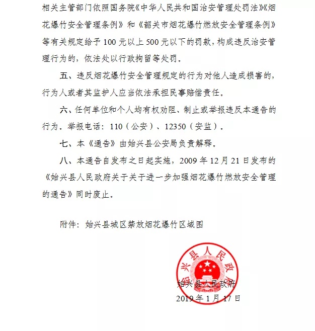 六、本通告(新府规审〔2019〕2号)自2020年1月1日起施行,有效期五年,《新丰县人民政府关于在县城烟花炮竹禁放区严禁销售燃放烟花爆竹的通知》(新府〔2012〕1号)同时废止。
