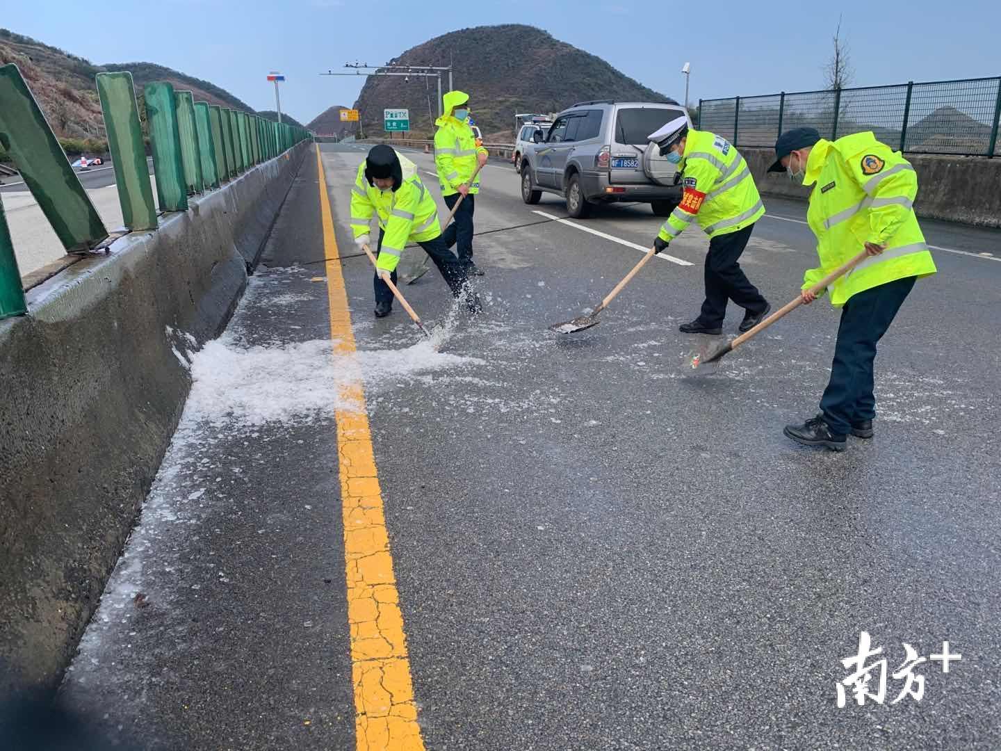 当日上午8时左右,京珠北路面部分桥面仍然有少量积雪,交警高速一、三大队组织民警对部分危险较大路段进行了人工清除积雪,争取气温回升后能加速冰层融化,尽早恢复通行。