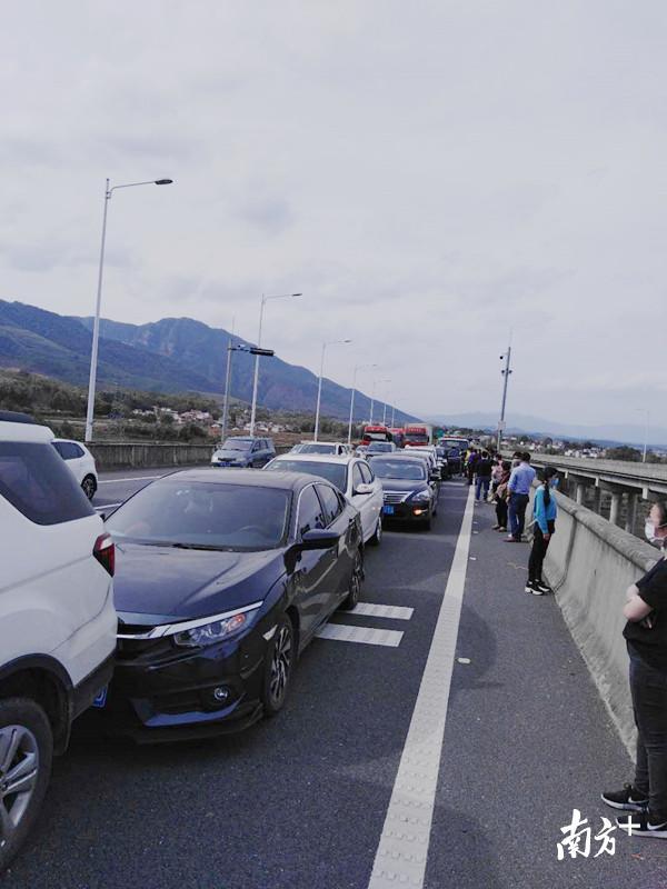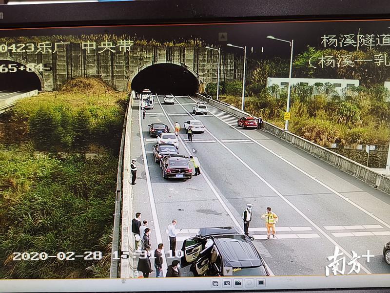2月28日下午14:45时,乐广高速公路南行K65杨溪隧道入口处发生多起共涉15车连环追尾交通事故,无人员伤亡。由于正值复工返岗车流高峰期,乐广高速南行日均车流量超过1.5万辆次;且事故涉及车辆、人员较多,现场已有多名人员在路面逗留、行走,对交通安全、秩序造成较大影响。