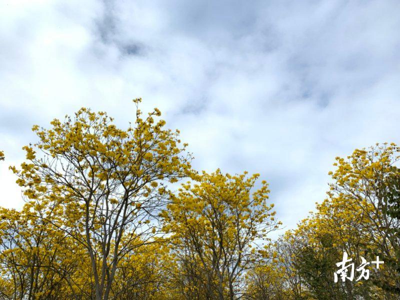 丰景苗圃的一大片黄花风铃木开花了,远远望去,一条金黄的毛毯点缀在大地上,金灿灿的花海犹如置身于童话世界;细看花儿又像一只只风铃悬挂在树上,随风摇曳,仿佛能听到清脆的铃声,美不胜收。