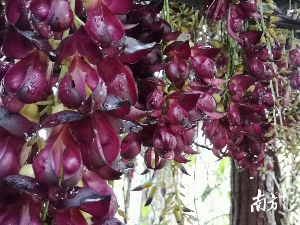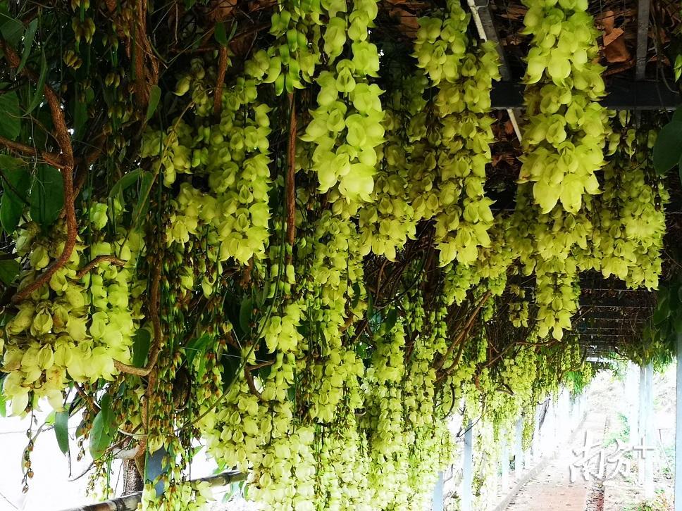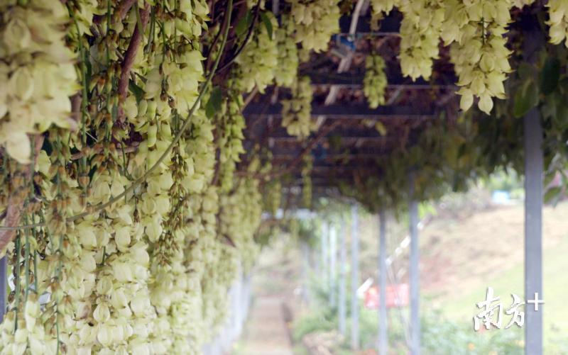 在顿岗开心农庄,农庄里种植的白色禾雀花此时已经盛开。浓郁的花香扑鼻而来,一串串乳白翠绿的花朵从藤蔓上垂下来,好像一只只雀鸟振翅欲飞。