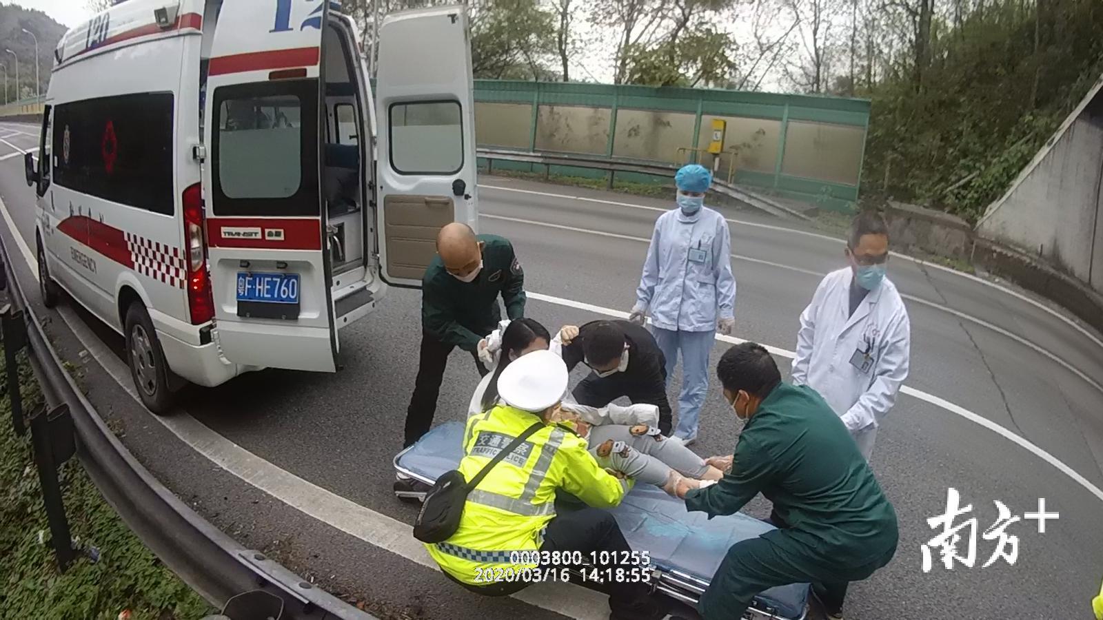 3月16日下午14时许,在韶关境内的南韶高速公路回龙山隧道内的东行方向,两辆小车发生追尾交通事故。前车女乘客(孕妇)胡女士在突感腹部不适,无法继续行走。