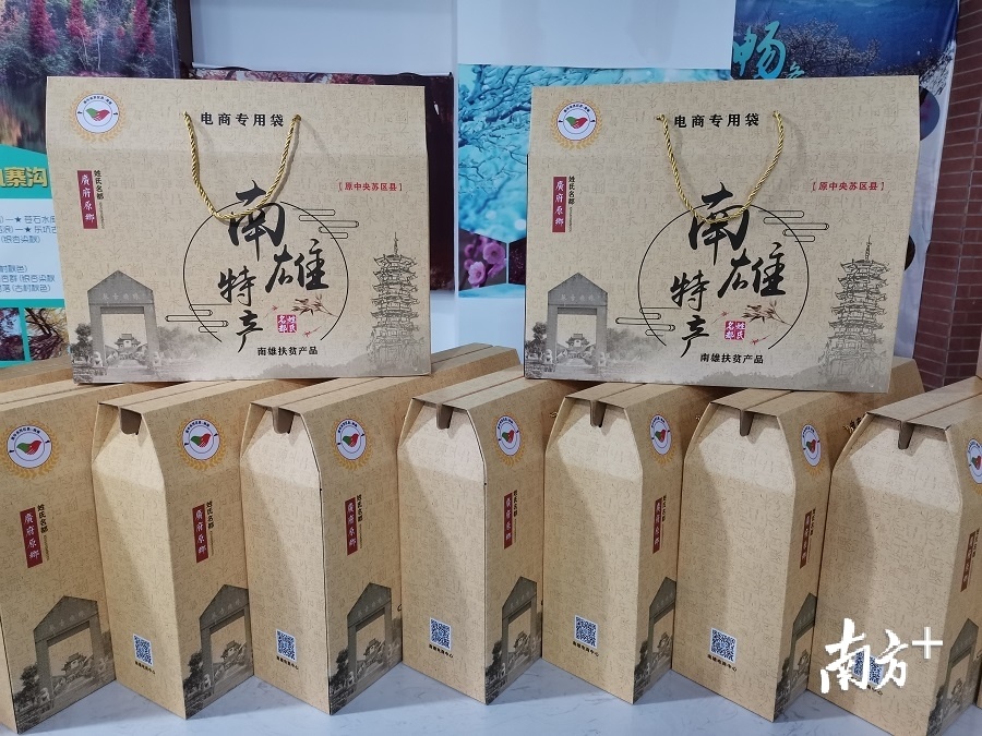 而在另一边,工作人员正在将扶贫产品打包成“特色大礼包”。充满古风韵味的电商专用袋上印有南雄扶贫产品LOGO,珠玑古巷、三影塔等地标建筑图样以及“广府原乡”“姓氏名都”等经过专业设计的标语融入其中,处处体现了南雄元素,一改以往传统农产品的简单包装风格,化身为高端、上档次的“大礼包”,既进一步宣传推介了南雄本土文化,又增加了产品的附加值。