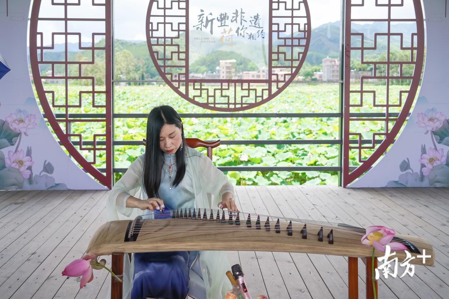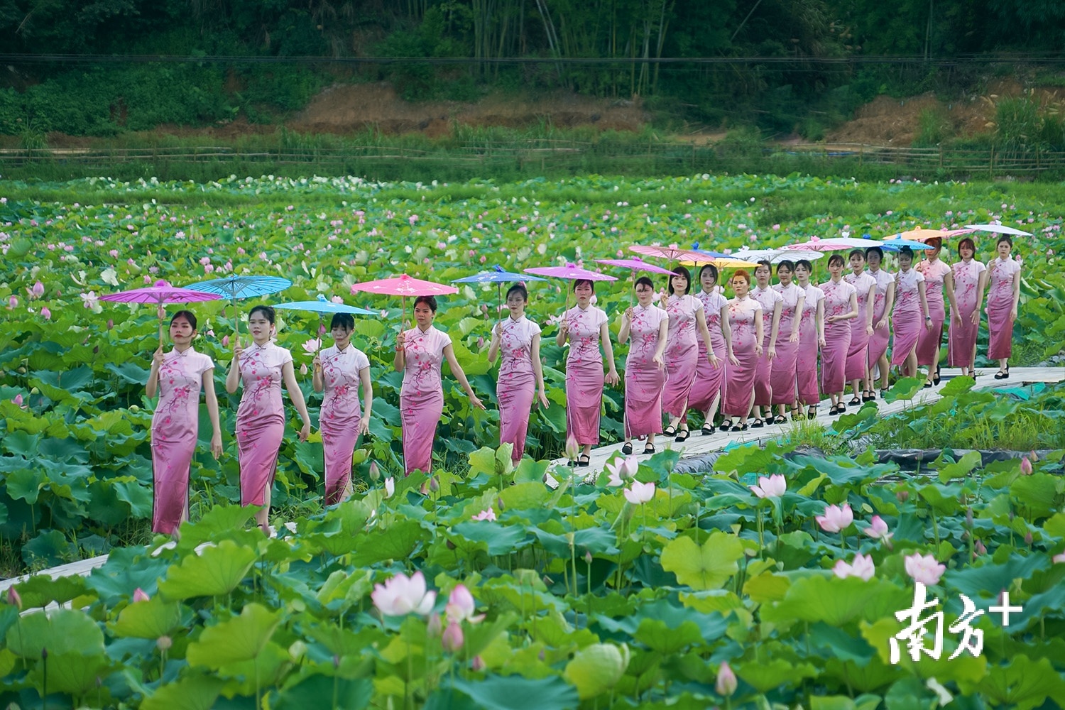 除了非遗项目展演,现场设有特色集市,展销新丰的特色美食、旅游手信和特色优质农产品,以旅促农;设有非遗展区,现场展示省级非遗项目张田饼印的雕刻技艺和米饼制作,让游客近距离体验;设有汽摩展示,将体育活动与文旅活动创新融合。而在不远处的千亩荷塘内,群芳盛放的遥江莲基地上演了旗袍走秀、古筝弹奏、茶艺展示等节目,让精彩不断、欢笑不断。丰富多样、别有新意的活动形式,全方位传播了“岭南避暑胜地”的人文之美和自然之美。
