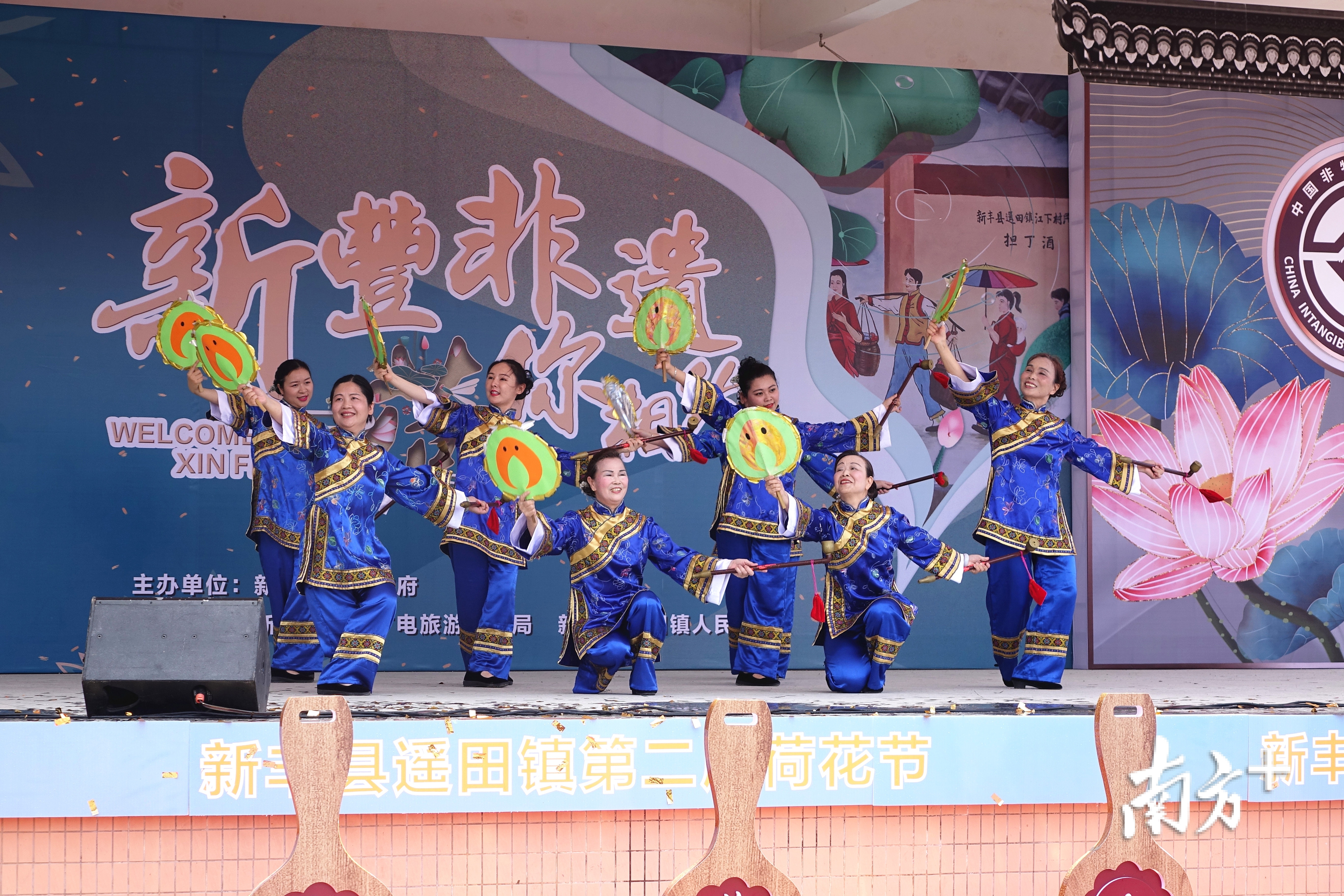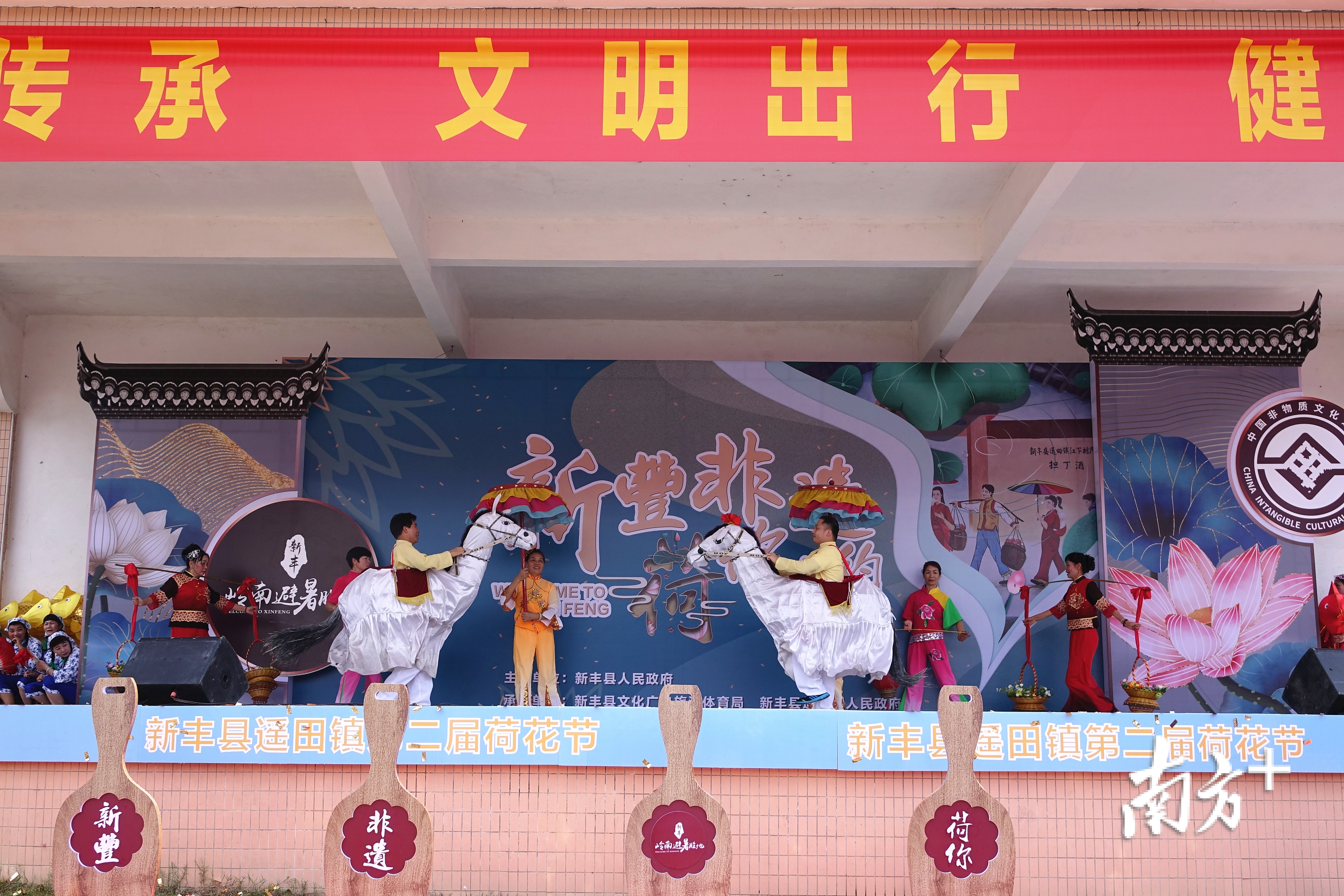 开幕式上,荷花舞《荷引画桡》带来精彩的开场舞,瞬间点燃观众的激情;女声独唱《荷花梦》带大家进入荷花的恬美梦乡;采茶行当表演《媒婆照镜》展现了国家级非遗项目采茶戏的浓郁特色;市级非遗项目《纸马舞》生动演绎走村过屋、拜贺佳节、娱乐大众的场景,营造了祥和快乐的喜庆气氛;市级非遗项目《鲤鱼舞》以民俗“舞鲤鱼”象征“吉兆新年”,寓意岁稔年丰;市级非遗项目《舞春牛》以牛和人们农事活动为内容,再现尽情歌舞、欢庆丰收的喜悦,祈祝更好收成;市级非遗项目《担丁酒》是遥田镇江下村的传统民俗,作为庆贺添丁的一种仪式,充分体现了群众对丁财两旺的追求和美好生活的向往......一系列各级非遗项目的接续展演,一次又一次将现场气氛推向高潮。