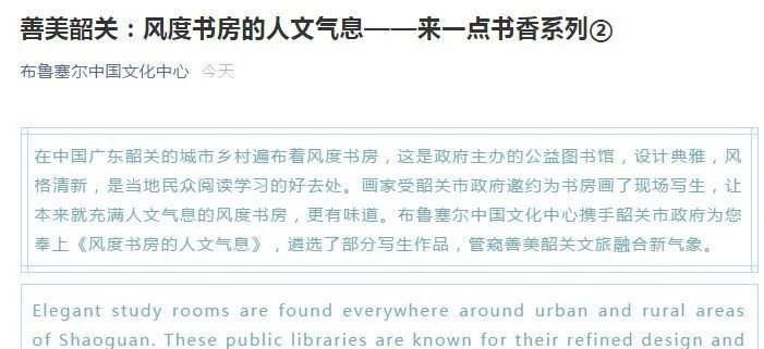 今年以来,布鲁塞尔中国文化中心先后通过公众微信号推送了“云·游中国”善美韶关系列推文,向世界介绍韶关的资源风光、城乡风貌、民俗文化和山水林田屋等。8月4日,布鲁塞尔中国文化中心再次聚焦韶关,又一次向世界介绍韶关的文化新名片——风度书房。韶关发布转载该微信号相关内容,一起来领略善美韶关风度书房的人文气息。