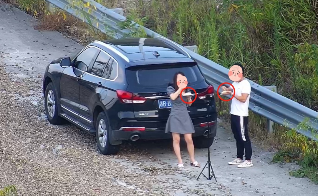 只见情侣二人在高速公路上玩起了花式自拍,还边吃蛋糕边拍,丝毫没有意识到身处险境,“秀”上了恩爱。