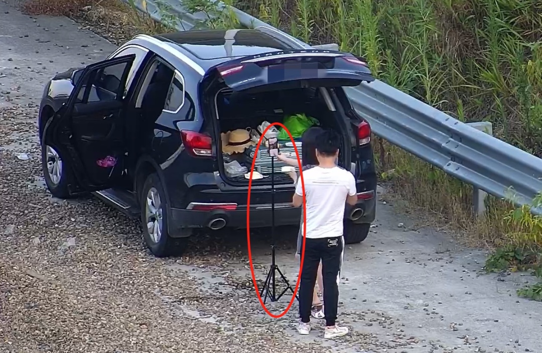 不一会儿,车上下来一男一女。只见他们从后尾箱拿出一条长长的架子,交警蜀黍定睛一看——居然是个用来固定摄影设备的三脚架!