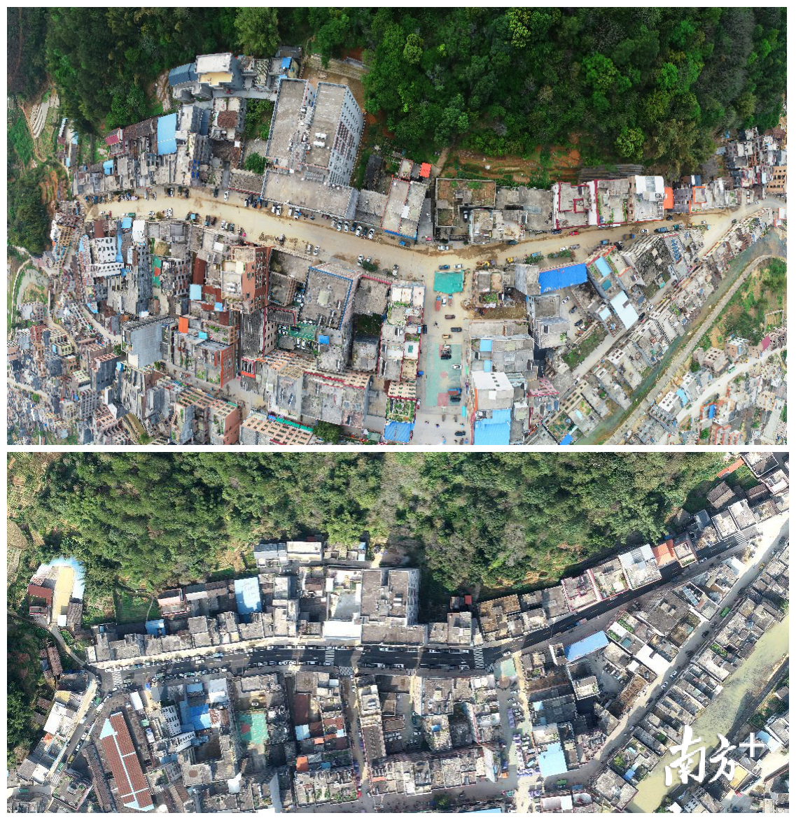 岭下路施工前后航拍图对比