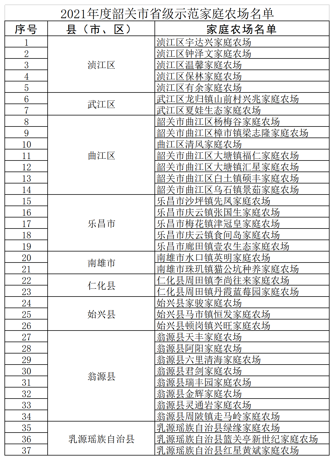 根据广东省农业农村厅《关于开展省级示范家庭农场认定和监测工作的通知》,韶关市积极组织经营规模稳定适中、配套设施完善、生产技术先进、经营管理水平高、综合素质好、示范引领作用明显的家庭农场申报广东省省级示范家庭农场。经过市农业农村局审核推荐,省农业农村厅审查,韶关市共有37家家庭农场成功被认定为“广东省2021年度省级示范家庭农场”。