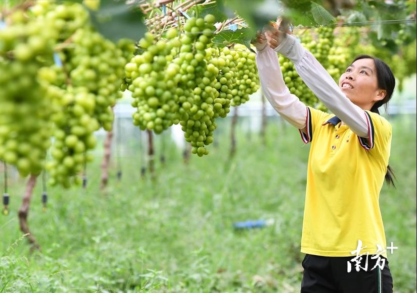 南雄市实施“百村兴业”工程,打造了16个千亩以上特色产业。图为乌迳镇黄金香印葡萄扶贫产业园。