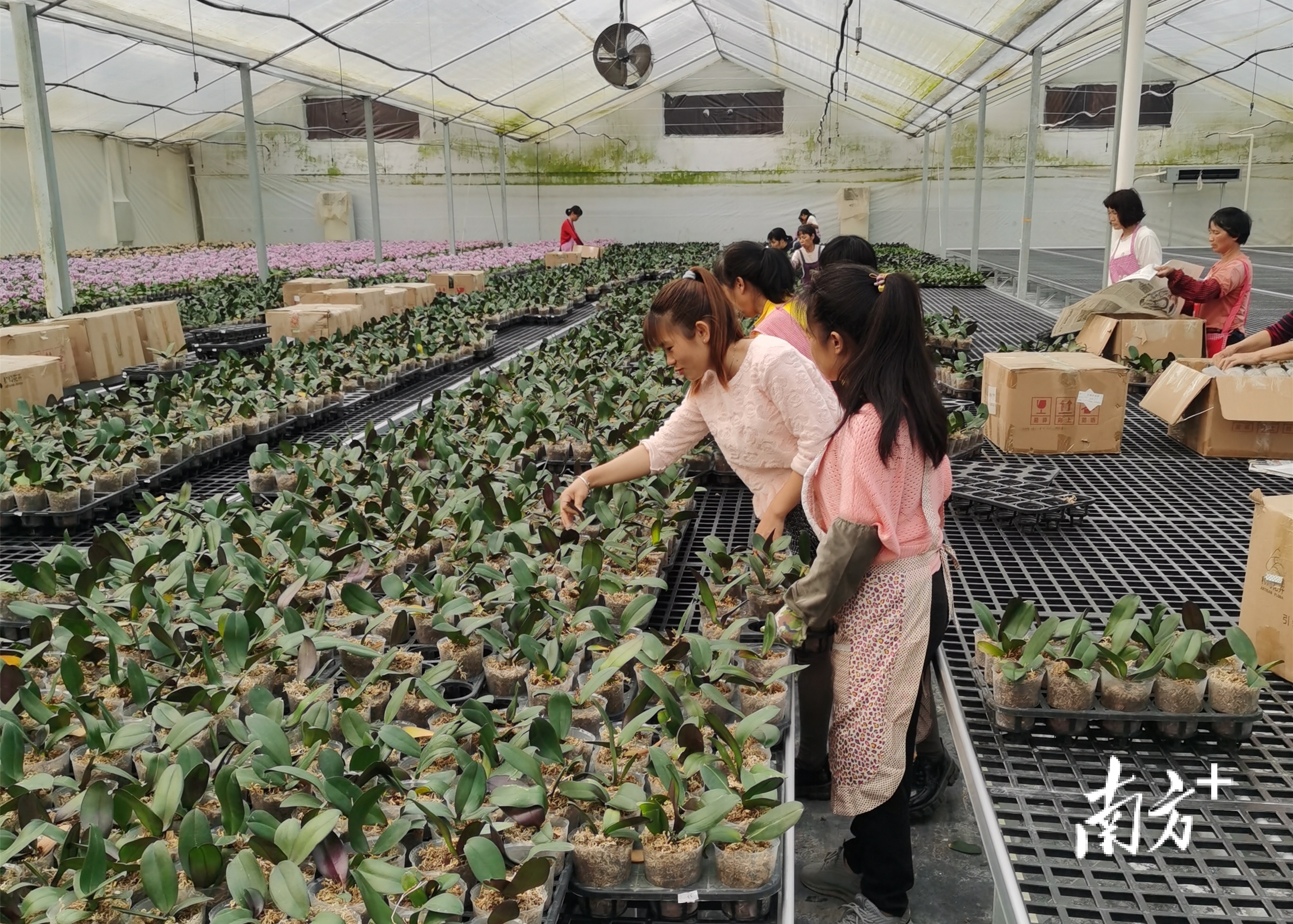 走进翁源县仙鹤花卉种植基地,一片花海映入眼帘。蝴蝶兰娇艳、国兰雅致,阵阵花香沁人心脾。工人们熟练地筛选、打包、装箱,一箱箱生机勃勃的兰花惊艳了初夏的好时光,即将发往全国各地。