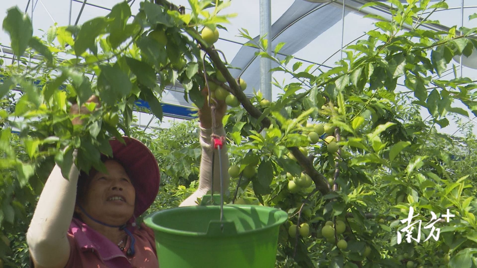 近日,笔者走进基地果棚里看到,一颗颗早熟李簇拥在枝叶间,青里透红,晶莹剔透,工人肖君海把桶挂在树梢,熟练地挑拣果实并完成采摘。