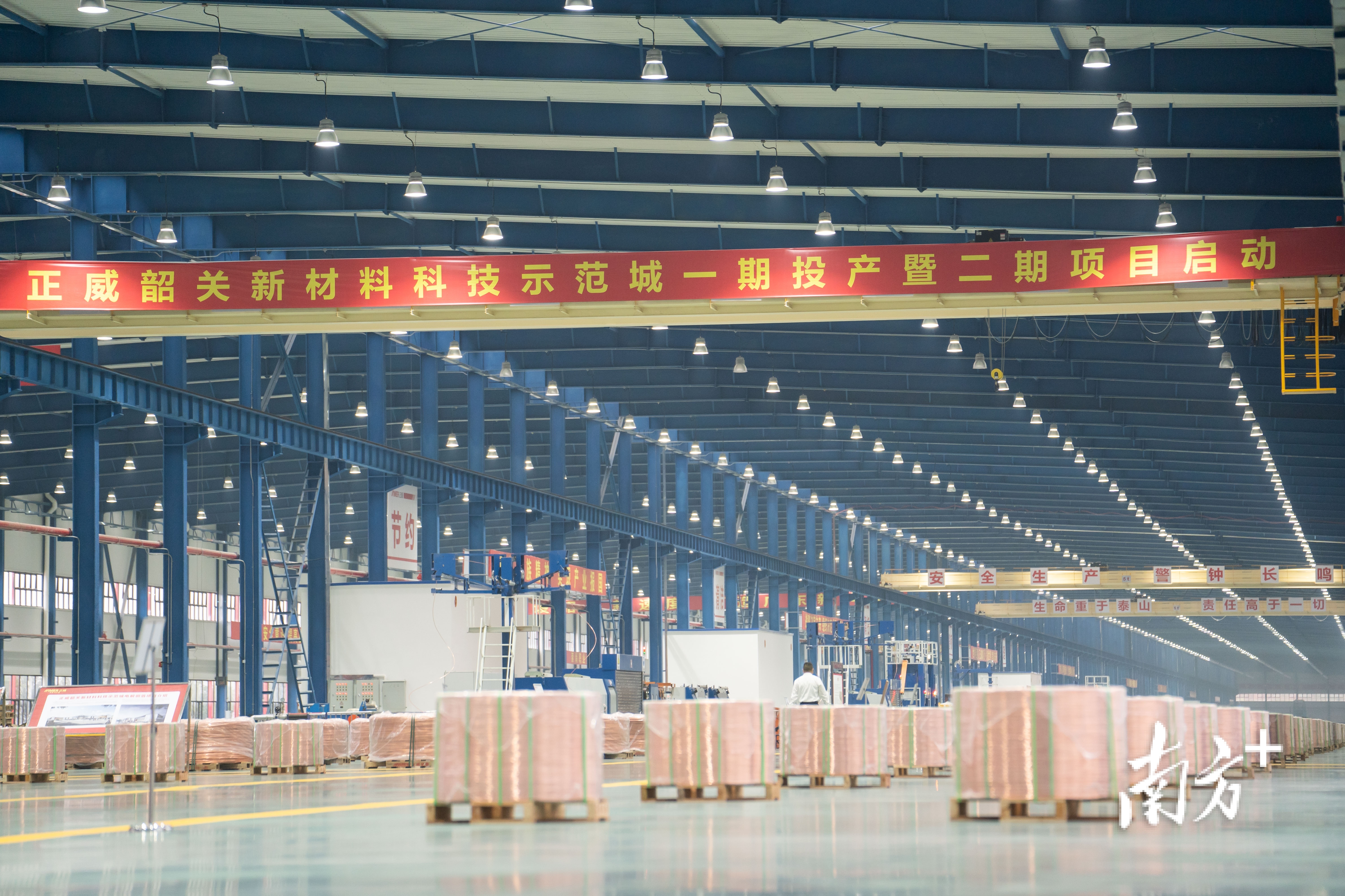 5月10日,在韶关市浈江区的正威韶关新材料科技示范城中,长1318米、宽69米的一期厂房如同一条巨龙,匍匐在广袤的土地上。厂房内,绞线机“火力全开”飞速旋转,生产好的精密铜线整齐排放,这意味着一期厂房正式投产。