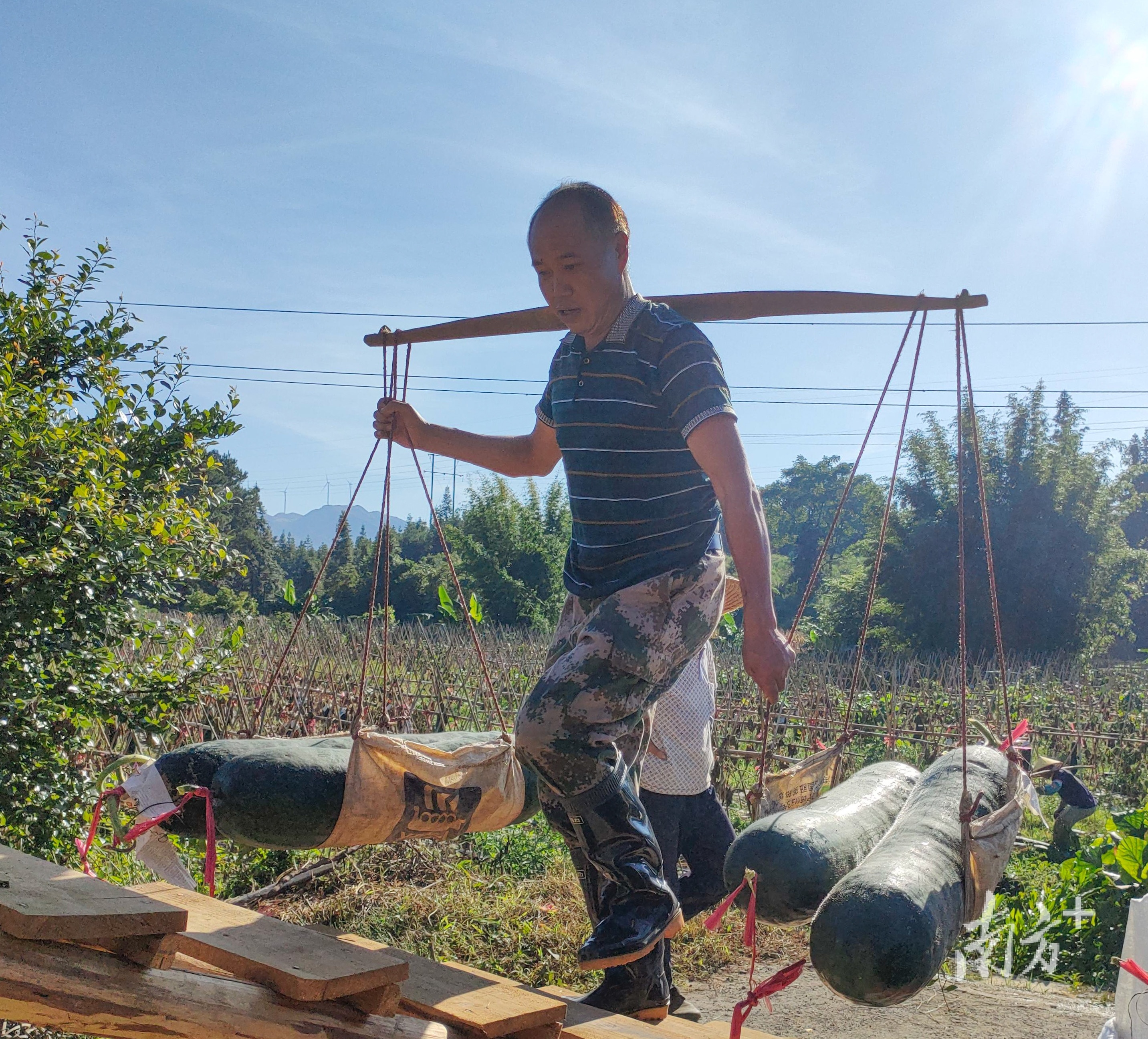 “亩产万斤,这个有1.3米,大概有40公斤。”大布镇埕头村党支部书记黄新强拿出卷尺,双手贴着一铁皮冬瓜的瓜身一量,开心极了。放眼望去,一排排瓜架上挂满了硕大饱满的铁皮冬瓜,瓜农们来回穿梭,忙碌地采摘、搬运冬瓜,处处洋溢着丰收的喜悦。