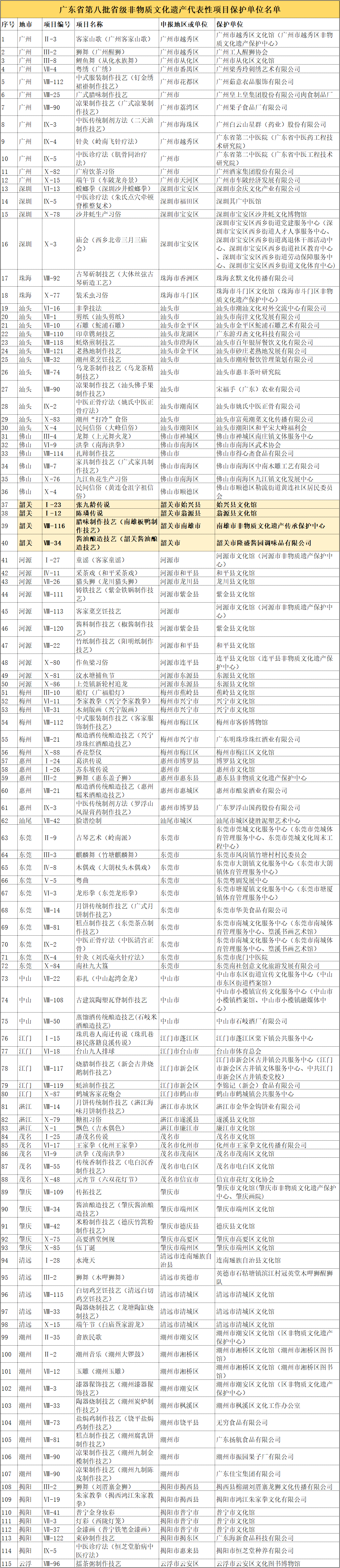 近日,广东省文化和旅游厅公布第八批省级非物质文化遗产代表性项目保护单位,认定115家单位为第八批省级非物质文化遗产代表性项目保护单位,其中韶关有4家单位进入名单。