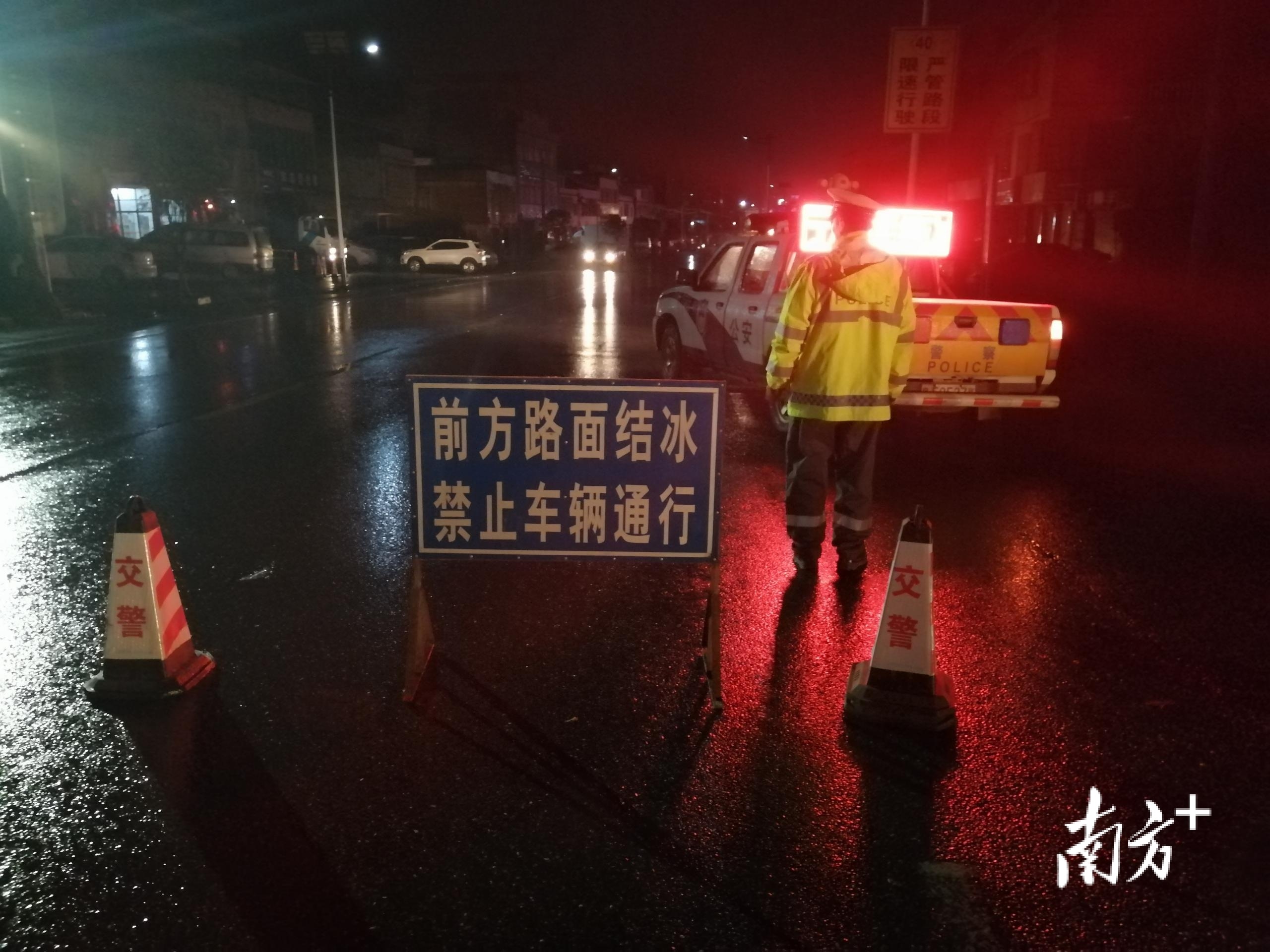 1月16日0时起,G240国道梅花段、云岩段等高海拔路段出现路面结冰现象,乐昌市公安局交警大队梅花中队与公路部门协同联动,通过撒盐融冰等措施联合应对冰冻路面情况,同时联合属地梅花、云岩派出所加强对沿线的巡逻管控,利用LED屏幕、大喇叭提醒过往车辆减速慢行,谨防因路面结冰造成交通事故,保障人民群众生命财产安全。