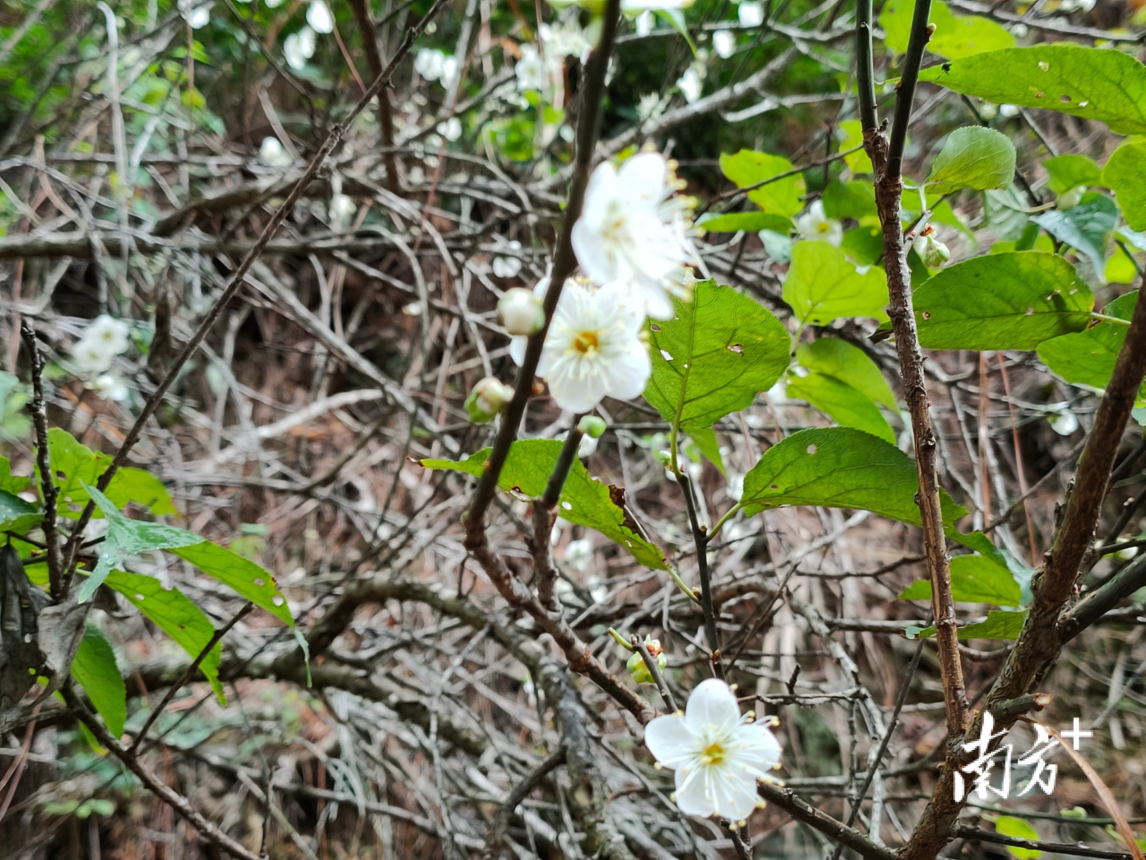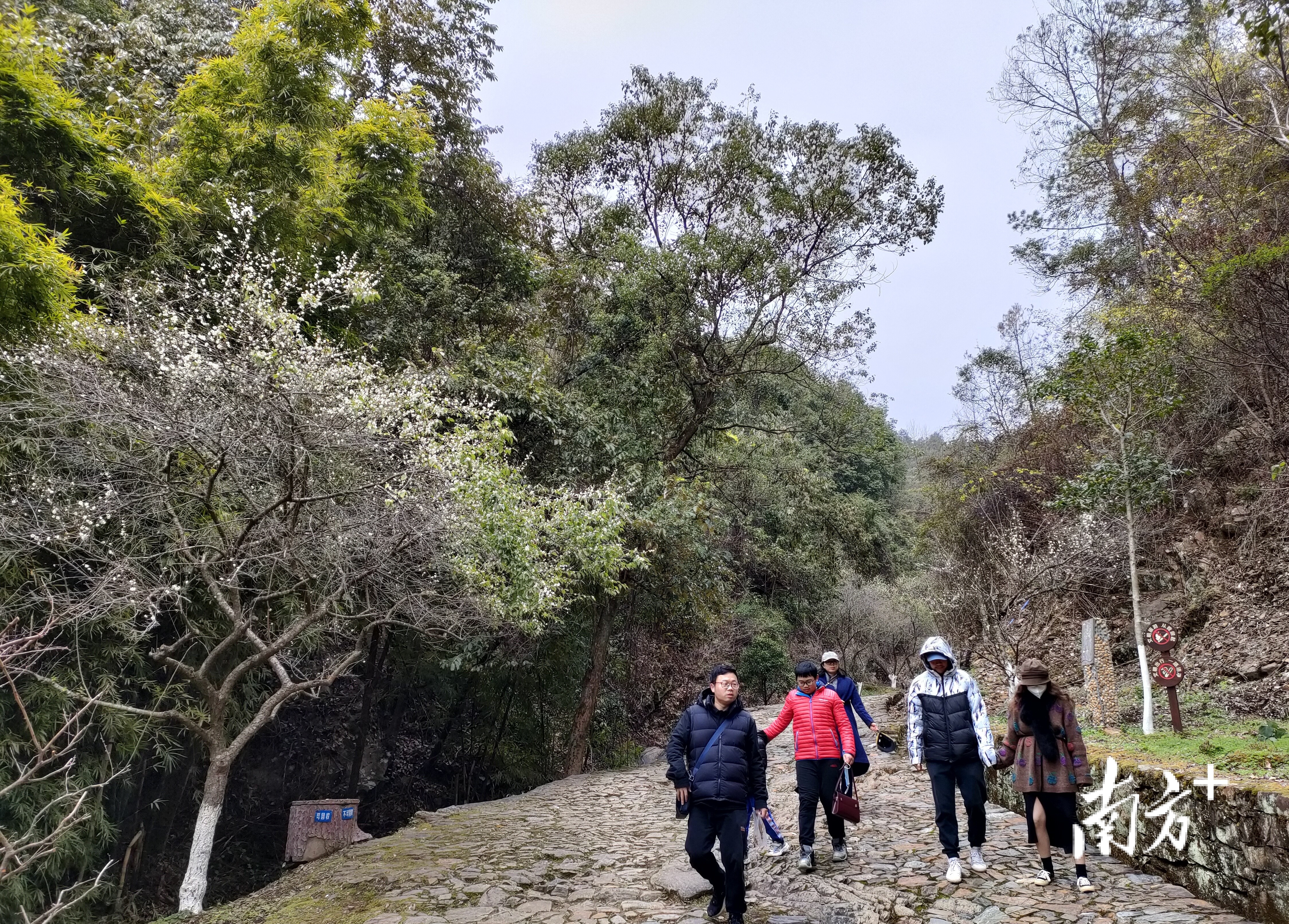 “现在梅关古道的梅花,在冬日的暖阳下越开越多,洁白的花瓣紧紧簇拥到一处,将鼻子凑近闻,还能感受到一阵阵沁人心脾的清香。”游客刘先生说。
