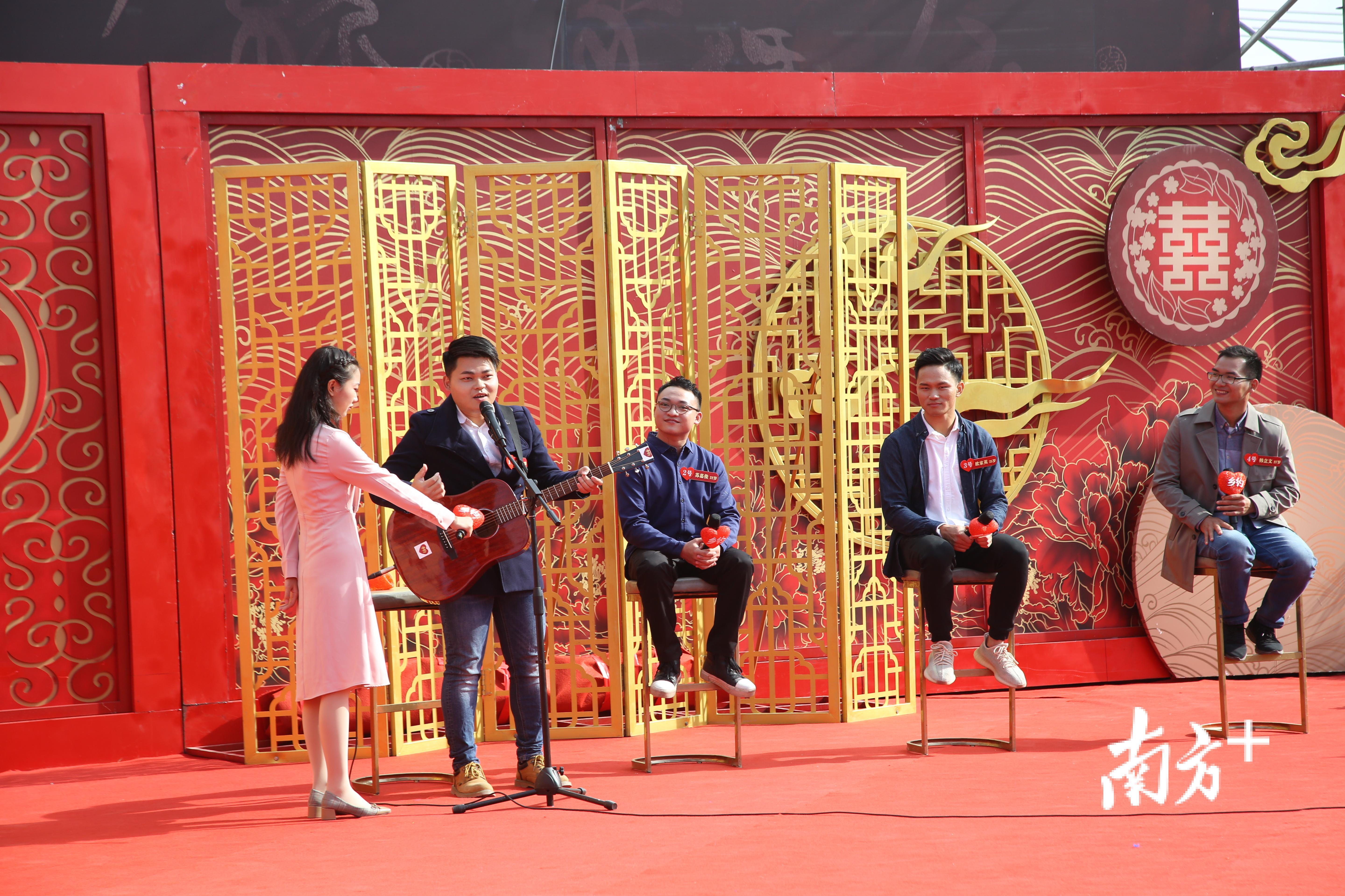 本期《乡约鼎湖》节目现场录制采取的是1女(主嘉宾)对4男(众嘉宾)的相亲模式,这5位嘉宾在台上通过婚恋问答、才艺展示等互动环节进行相互选择。