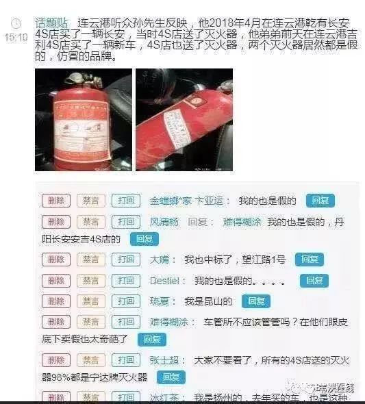前段时间,来自省内连云港市、无锡市、常州市、苏州市等多地消费者纷纷向江苏新闻广播反映,他们当地的汽车4S店,同样在销售疑似假冒伪劣的灭火器产品。亦有媒体对苏州市部分汽车4S店把假冒伪劣灭火器作为“福利”随车送给购车人的事件进行了曝光。
