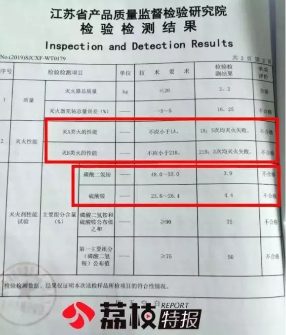 媒体报道后,相城区市场监管局迅速介入,查扣180余只疑似假冒灭火器。4月底,相城区市场监管局向江苏新闻广播提供检测报告,报告显示,查扣的1KG灭火器除了“总质量”符合国标“低于20KG”的要求外,其他所有性能指标均不合格。