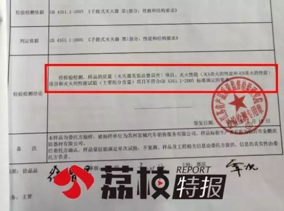 记者了解到,A类火、B类火分别指代固体燃烧火焰和液体燃料燃烧火焰,从报告可以看出,伪劣灭火器对这两类火的所有测试全部失败,完全不符合国家标准。而灭火剂主要组分磷酸二氢铵、硫酸铵更是远低于技术要求。“两家汽车4S店都无法提供灭火器详细的来源证明,”相城区市场监管局执法大队副大队长张旭表示,“我们将按照认证认可条例对他们非合格生产的灭火器进行处罚。”