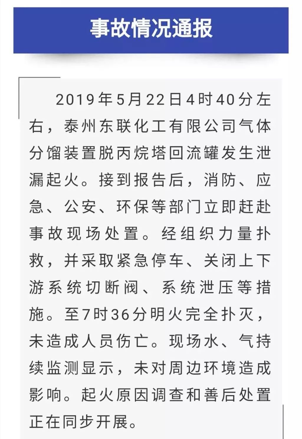5 月 22 日上午,泰州市应急管理局发布情况通报:2019 年 5 月 22 日 4 时 40 分左右,泰州东联化工有限公司气体分馏装置脱丙烷塔回流罐发生泄漏起火。接到报告后,消防、应急、公安、环保等部门立即赶赴事故现场处置。经组织力量扑救,并采取紧急停车、关闭上下游系统切断阀、系统泄压等措施。至 7 时 36 分明火完全扑灭,未造成人员伤亡。现场水、气持续监测显示,未对周边环境造成影响。起火原因调查和善后处置正在同步开展。