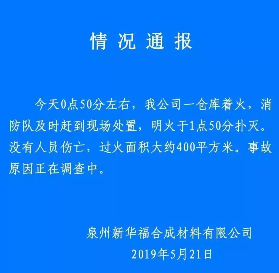 5月21日凌晨,有网友称,福建省泉州市泉港区一公司发生着火事故。记者了解到,发生火情的地方是当地公司的一个仓库。而后该仓库所属公司泉州新华福合成材料有限公司通过泉州市泉港区应急管理局微信公众号“泉港应急管理”发布情况通报。火情发生后,经消防队及时处置,明火已扑灭,事故原因正在调查中。