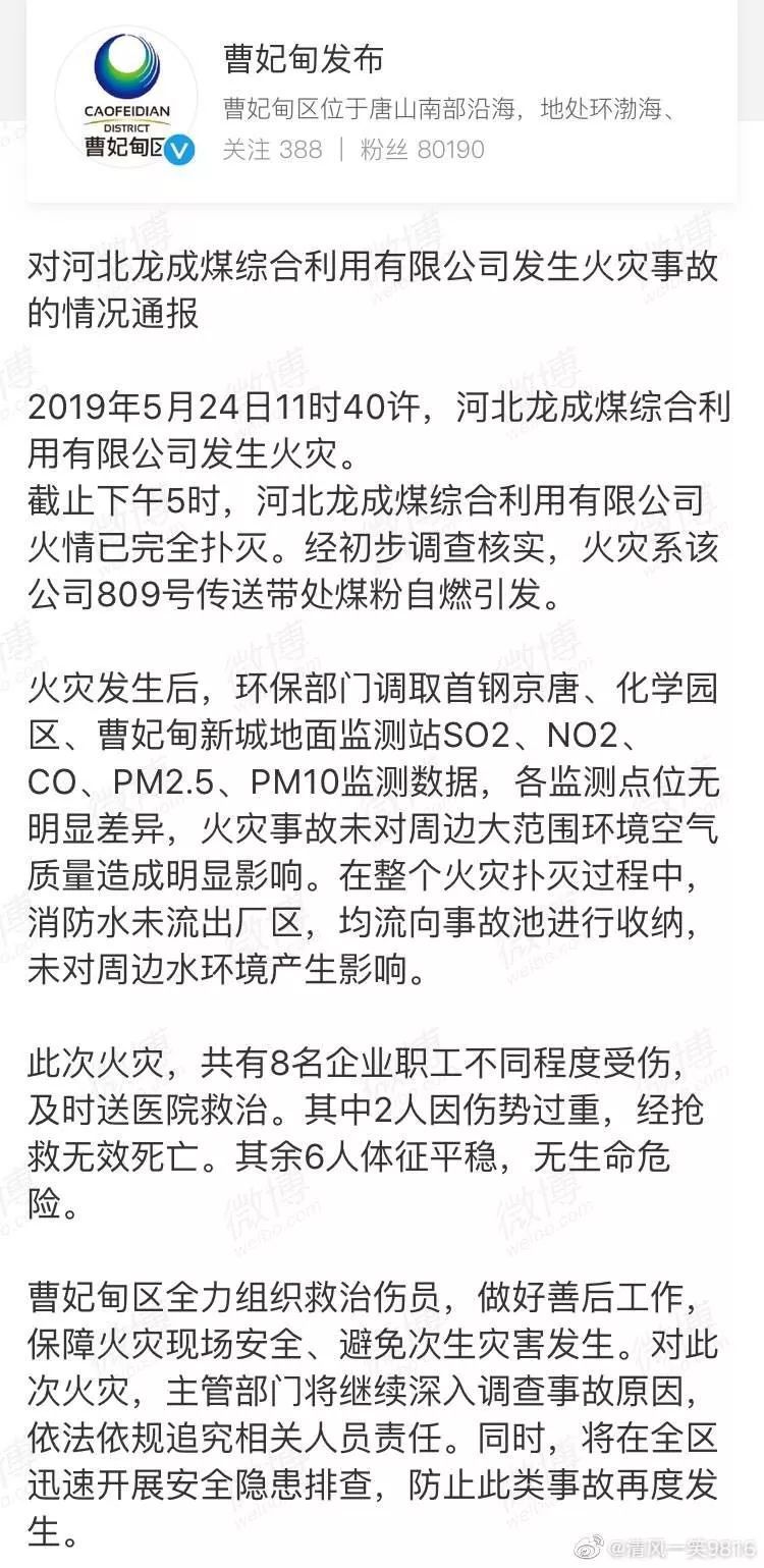 唐山曹妃甸区政府新闻办公室官方微博发布对河北龙成煤综合利用有限公司发生火灾事故的情况通报。通报内容如下: