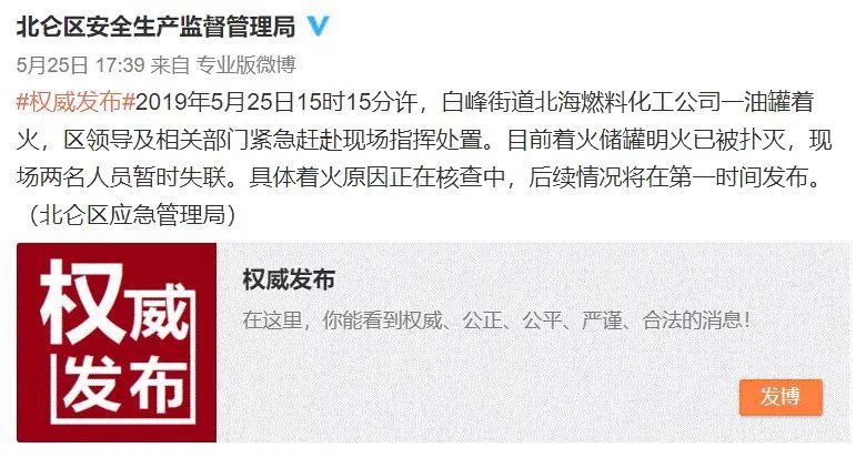 浙江省宁波市北仑区安全生产监督管理局官方微博5月25日发布消息称,2019年5月25日15时15分许,(浙江宁波北仑区)白峰街道北海燃料化工公司一油罐着火,区领导及相关部门紧急赶赴现场指挥处置。目前着火储罐明火已被扑灭,具体着火原因正在核查中,后续情况将在第一时间发布。随后该官博发布续报称,经相关部门全力搜救,现场找到1名失联人员,经确认已不幸死亡,另1名仍在全力搜救中。经环保部门持续监测,周边环境暂未发现异常。