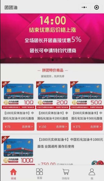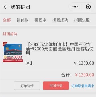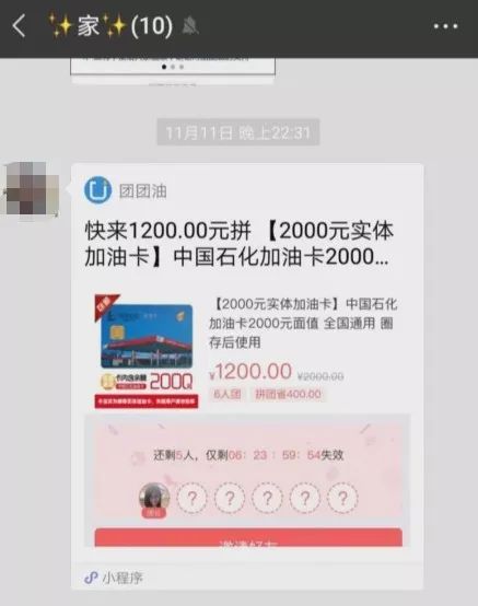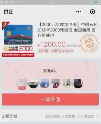 罗先生告诉记者,“双11”那天,家人群里有家人分享了一个名叫“团团油”小程序,里面有1200元购2000元油卡的拼团链接,也就是相当于六折,而且6人即可成团。一开始罗先生还有些怀疑,但小姨子说自己之前已经买过这种油卡了。