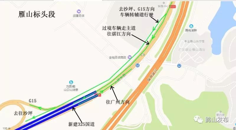 G325线鹤山改线工程全长13.28公里,主道为双向六车道,最高限速为每小时80公里,沿途不设红绿灯,从起点大雁山互通立交到终点桃源旺龙村附近,开车大概需要11分钟左右,要求不同车型分道行驶,其中最左侧设小客车专用道,过往车辆须严守交通规则,按照交通指示标志通行。