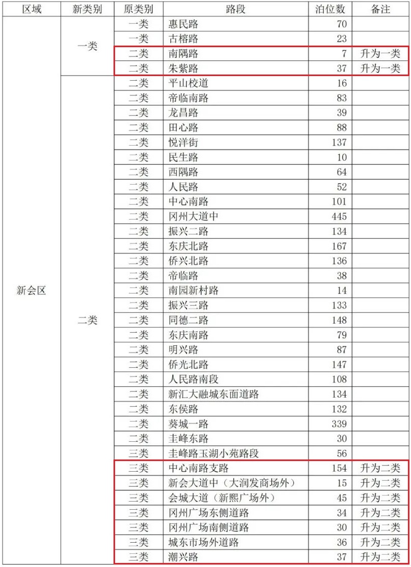 中心南路支路、新会大道中(大润发商场外)、会城大道(新熙广场外)、冈州广场东侧道路、冈州广场南侧道路、城东市场外道路、潮兴路均从三类升为二类。