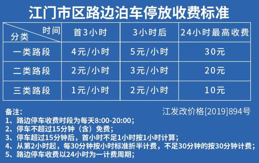 江门市区路边泊车停放收费标准。