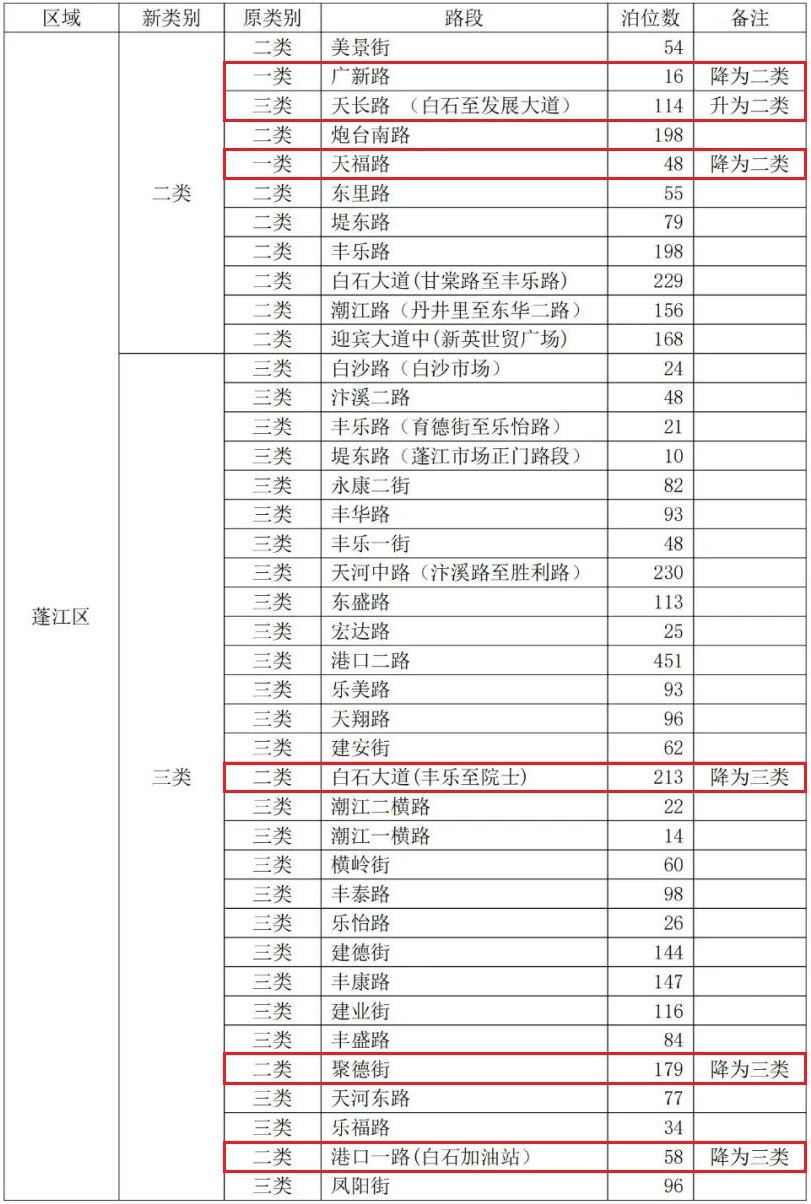 广新路、天福路从一类降为二类;