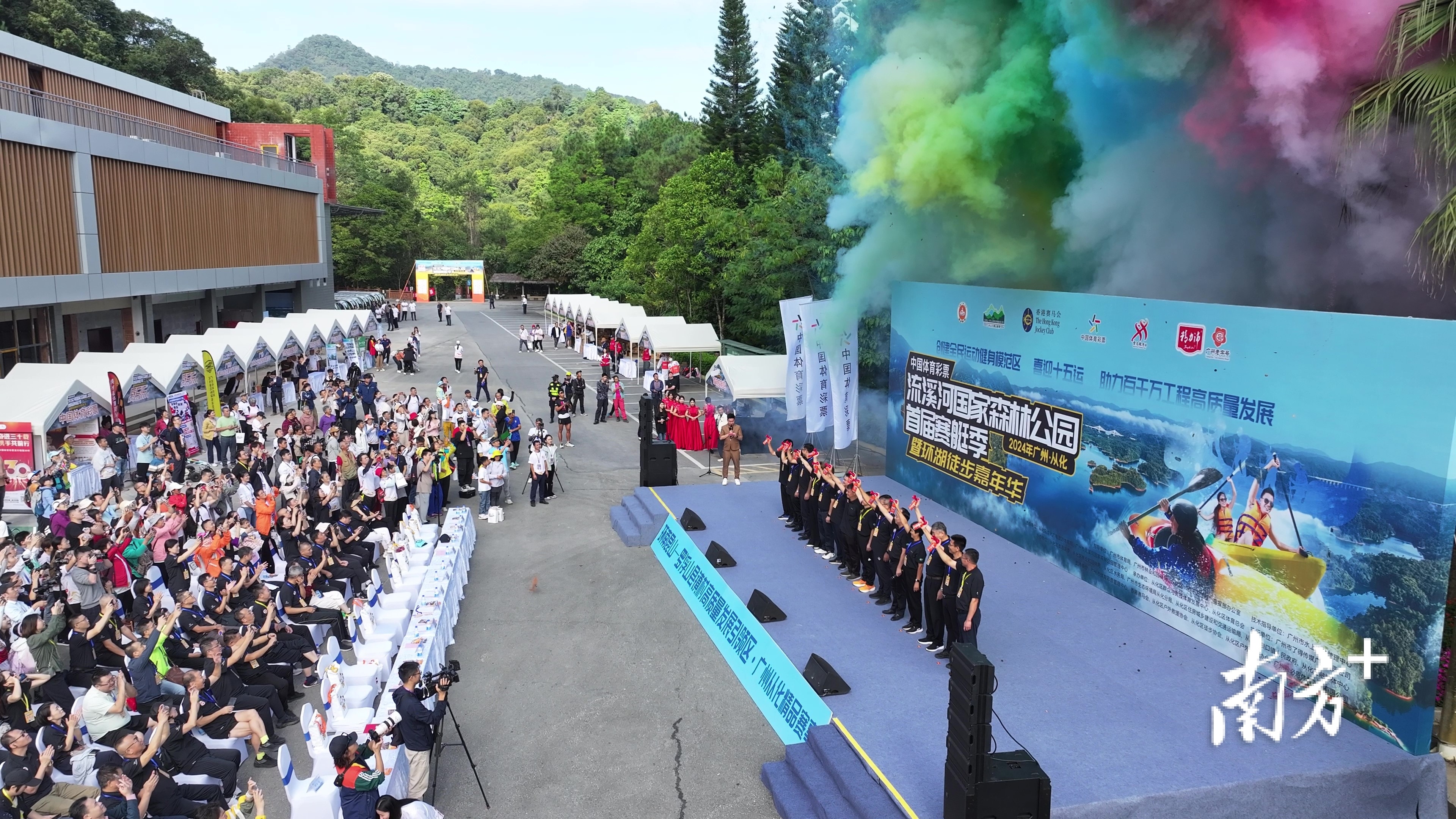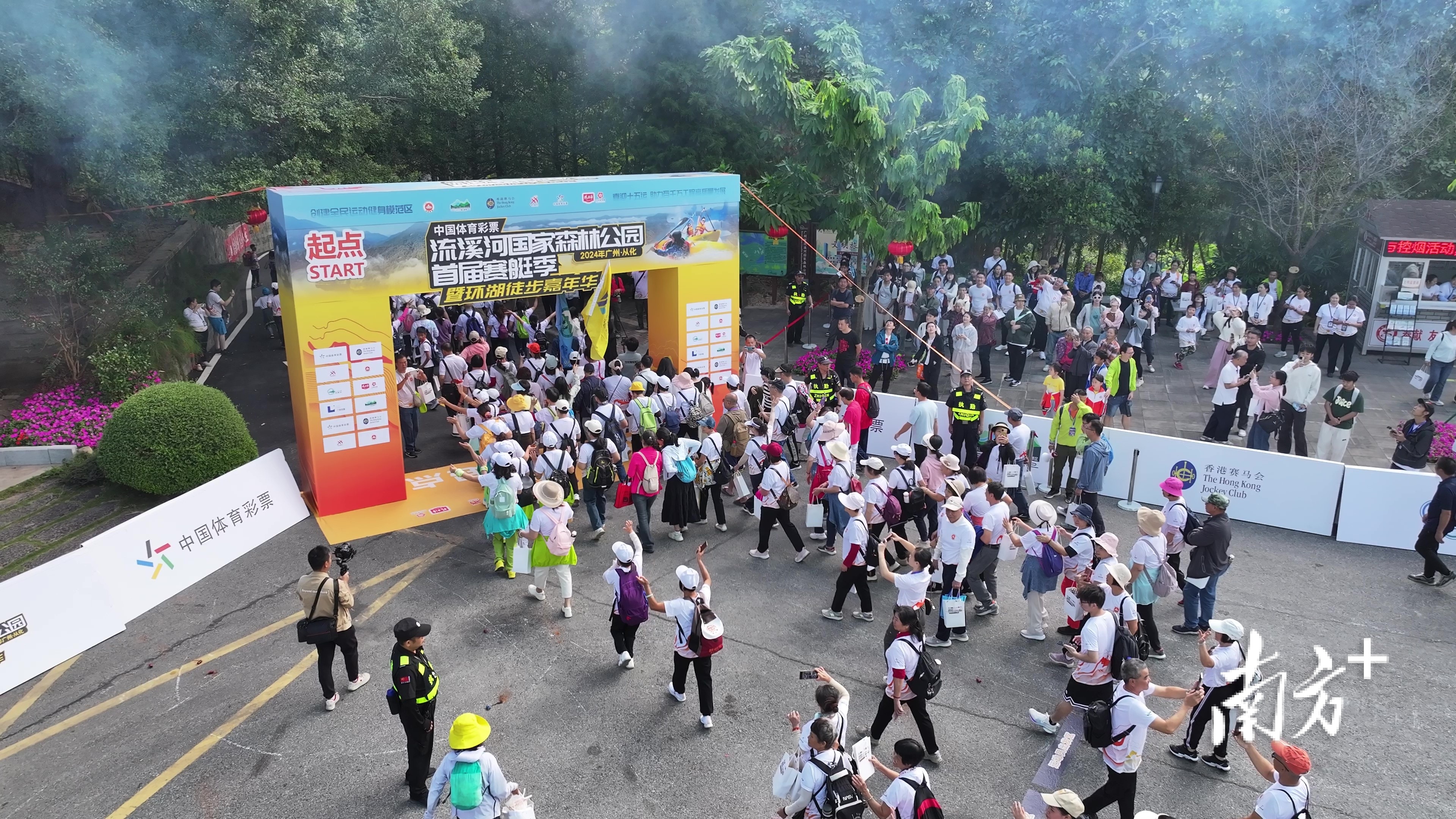上午10时,随着现场领导嘉宾共同上台鸣笛,中国体育彩票—广州市流溪河国家森林公园首届赛艇季暨环湖徒步嘉年华正式拉开序幕。