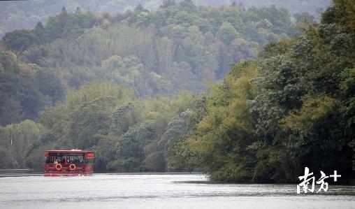 一艘游船缓缓行驶在流溪河水上绿道中,河面时而荡起层层涟漪,时而浮现江心小岛。河两岸缓坡上种植着各类草木花卉,形成富有层次感的美景。岸边还有着一条可骑行的绿道,一路上尽享满目绿色、清新空气、扑面煦风。“真是有一种‘船在江中走,人在画中游’的享受。”来自佛山的游客苏先生不禁感叹。