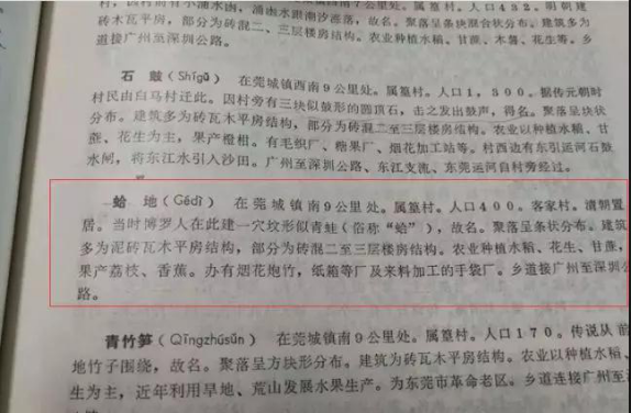 二、根据《东莞市地名志》(广东高等教育出版社,1987年)记载,“蛤地(Gédì)在莞城镇9公里处,属篁村,清朝置居。当时博罗人在此建一穴坟形似青蛙(俗称蛤),故名”,也佐实此“蛤”为青蛙的意思;