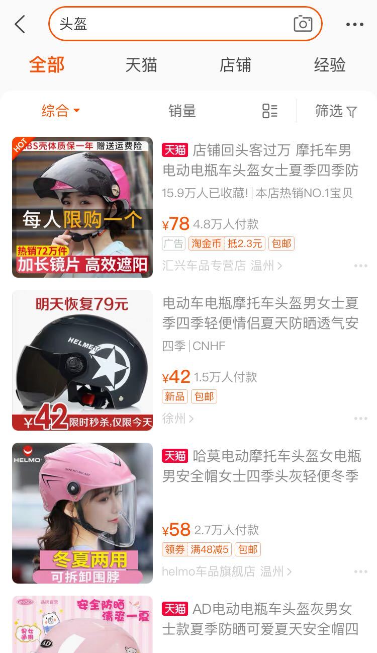 今日笔者在电商平台搜索“头盔”,前10款商品价格29—78元不等,相比网传的高价有所回落。