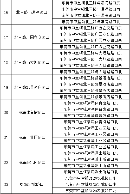 电子警察设置点分别为东江大道黄大仙路路口、东江大道企石沿江路路口、东江大道五八围路路口、东江大道兆丰路路口、东江大道深巷环村西路路口、东江大道深巷环村东路路口、东江大道铁岗荔园路路口、东江大道建塘路路口、东平大道东山凤凰路路口、东平大道纬二路路口、东平大道企石创业路路口、东平大道旧围村新塘新围路路口、东平大道钻石酒店路口、东平大道新江路路口、东平大道江南大道路口、东平大道五八围路路口、宝石路企横路路口、宝石路新南新河路路口、东平东江大桥、东平大道星光小学路段。