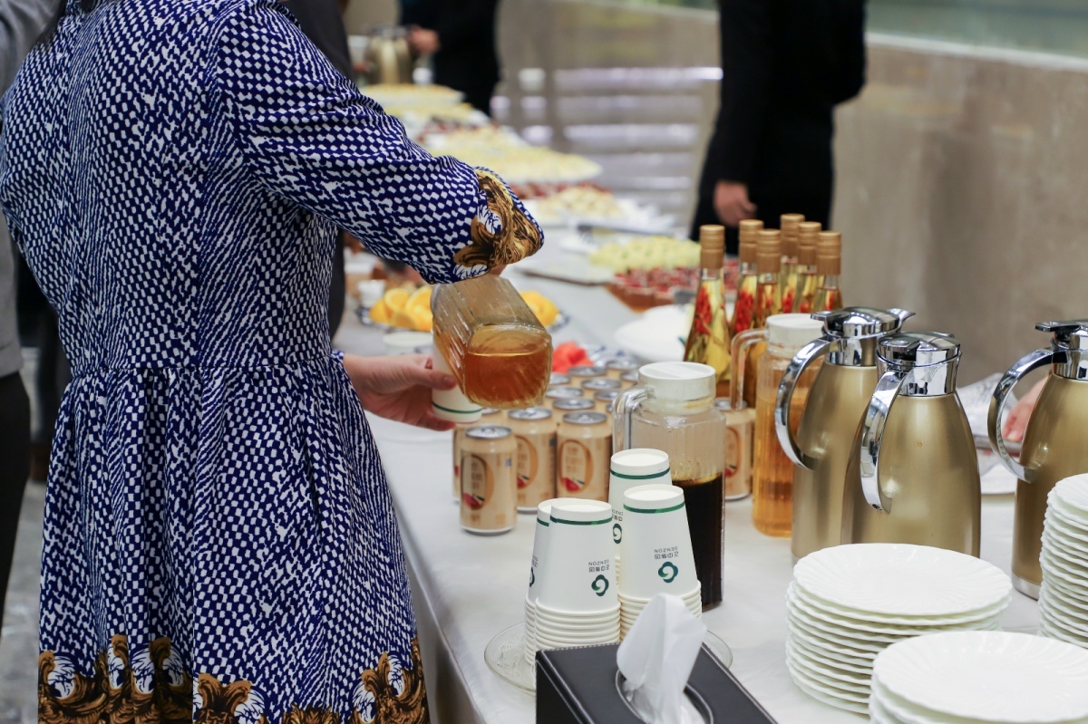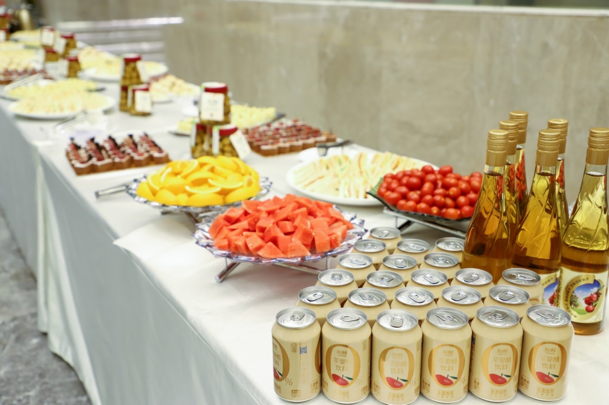 ▲茶歇期间,会与嘉宾品尝和鲜苹果醋饮料