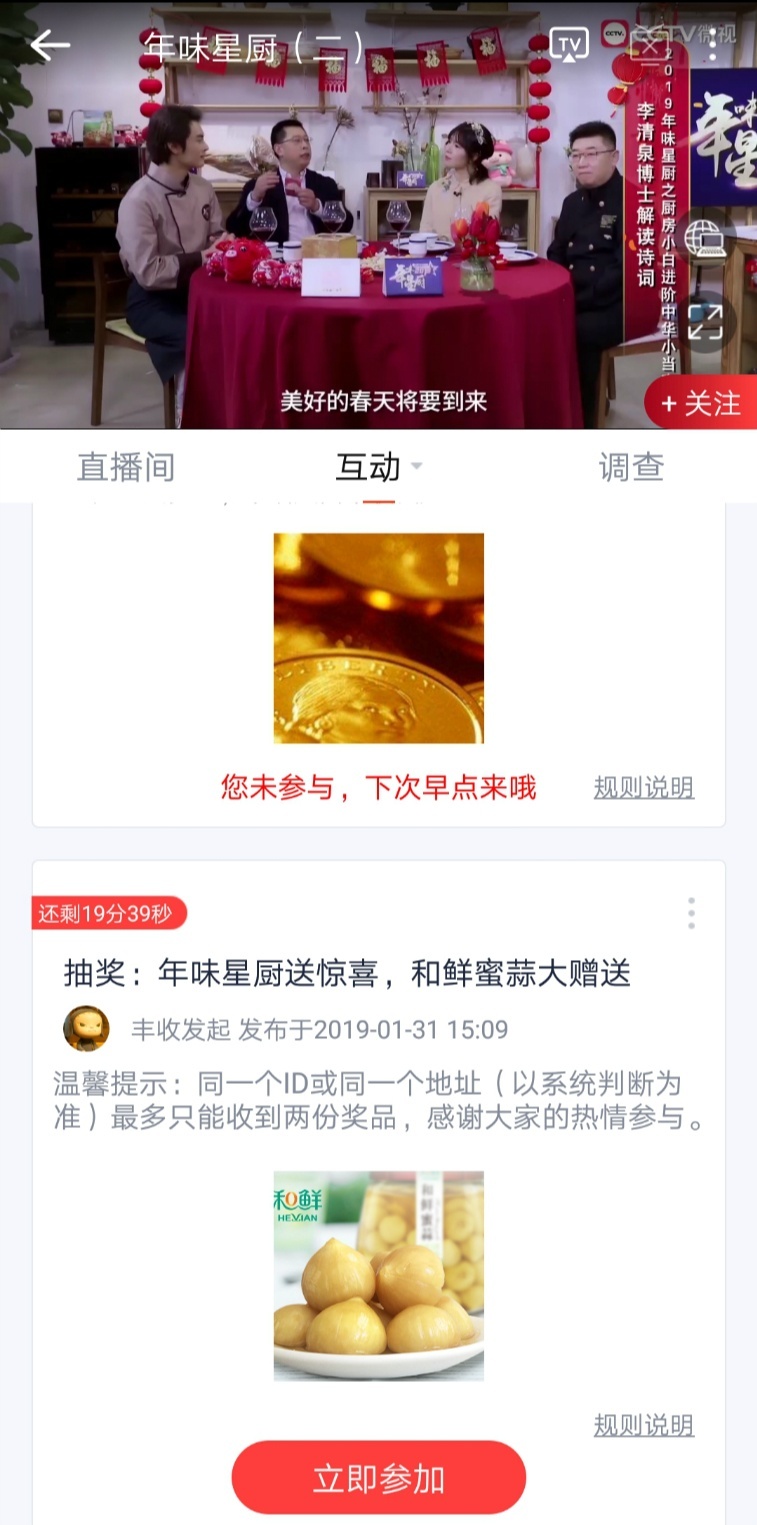 1月30日—2月3日每晚19:30,锁定CCTV微视客户端《年味星厨2019》!收看节目直播,点击“互动”按钮,即可参与节目抽奖,赢取健康养生大礼包。