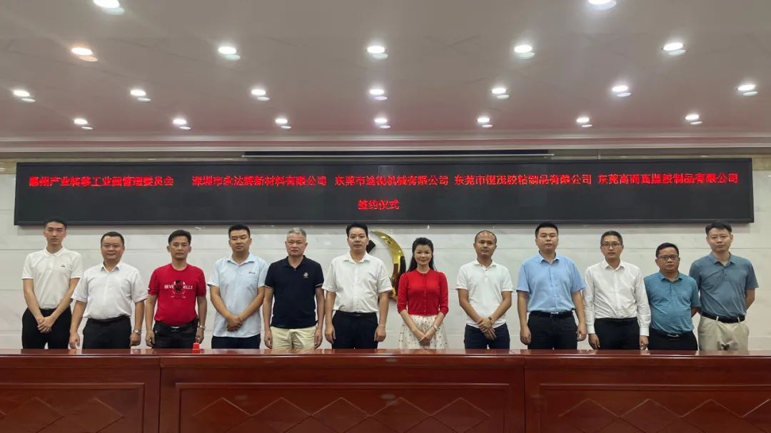 本次集中签约项目包括惠州市永达辉新材料有限公司光电薄膜材料、胶粘材料、高温材料、玻璃镀膜丝印材料研发生产项目,总投资3亿元;东莞市途锐机械有限公司专功能性薄膜热固化、光固化涂布机以及相关膜类、纸类、金属箔类分条机生产研发项目,总投资2亿元;东莞市恒茂胶粘制品有限公司金属遮罩材料、电气绝缘材料、双面胶贴及复合材料研发生产和精密加工项目,总投资1.6亿元;东莞市高而高塑胶制品有限公司研发、生产、销售供应新能源锂电胶带项目,总投资1亿元。