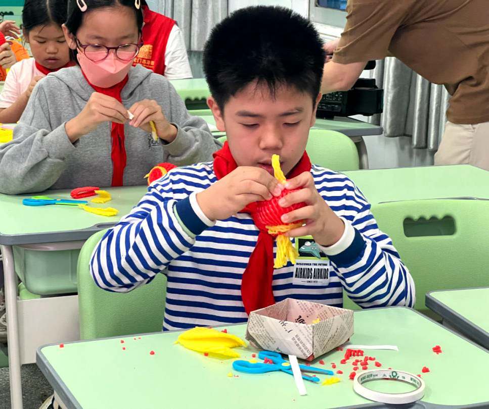 活动现场,志愿者们与孩子们一起用水果包装网套制作小灯笼,引导孩子们发挥创造力和想象力,利用生活垃圾制作出独特的环保作品,提高青少年对环保问题的认识和关注度。